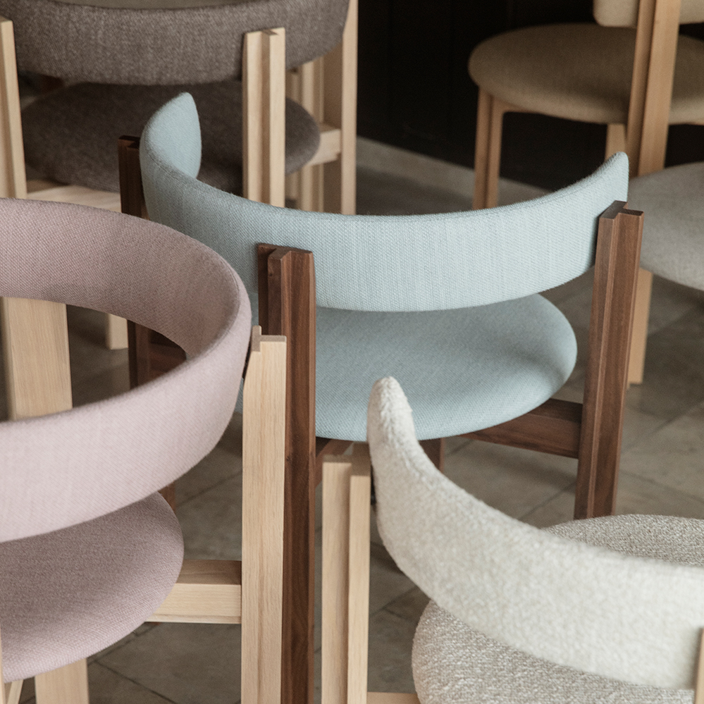 Den Principal Stuhl entwarf Bodil Kjær zusammen mit dem gleichnamigen Tisch im Jahr 1961, der Stuhl besticht durch eine klare Formgebung und das markante Gestell. Erhältlich ist der Principal Stuhl bei Karakter wahlweise ungepolstert oder wie hier mit einer Sitzpolsterung in dem Stoff Remix (weitere Stoffe gerne auf Anfrage).