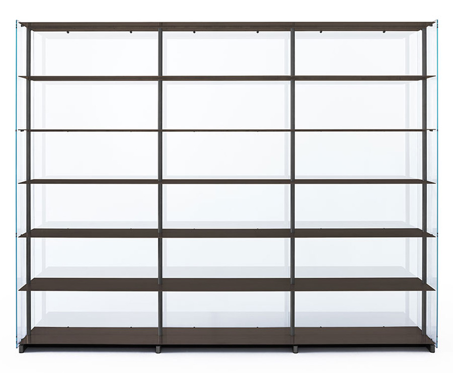Neben der Variante mit den seitlichen Glaswänden und schwarzen Aluminiumelementen, ist das Regal noch in der Materialkombination Kastanie mit Metallelementen aus eloxiertem Aluminium auf Anfrage erhältlich.