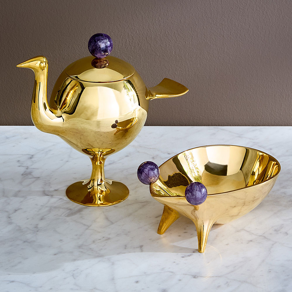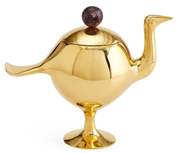 Die Skulptur in der Form eines Vogels von Jonathan Adler ist aus massivem, polierten Messing. Der Entwurf stammt aus dem Jahr 2024. Gedacht ist das Kleinod als Dose, der Griff ist ein Amethyst-Edelstein.