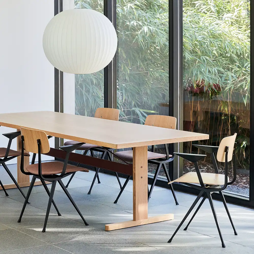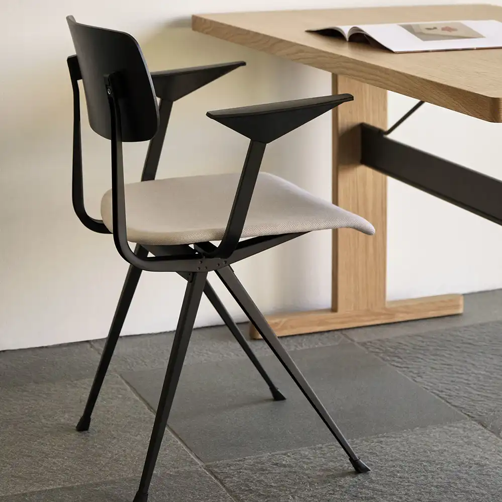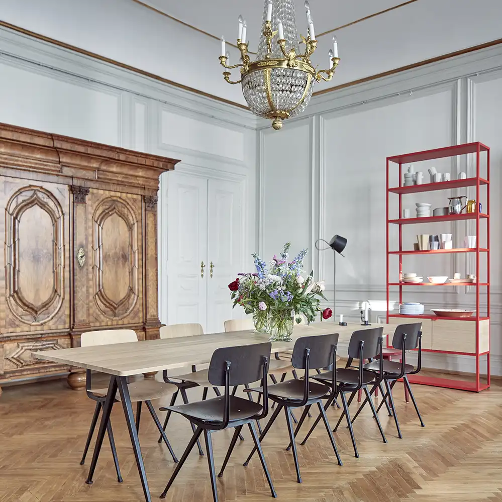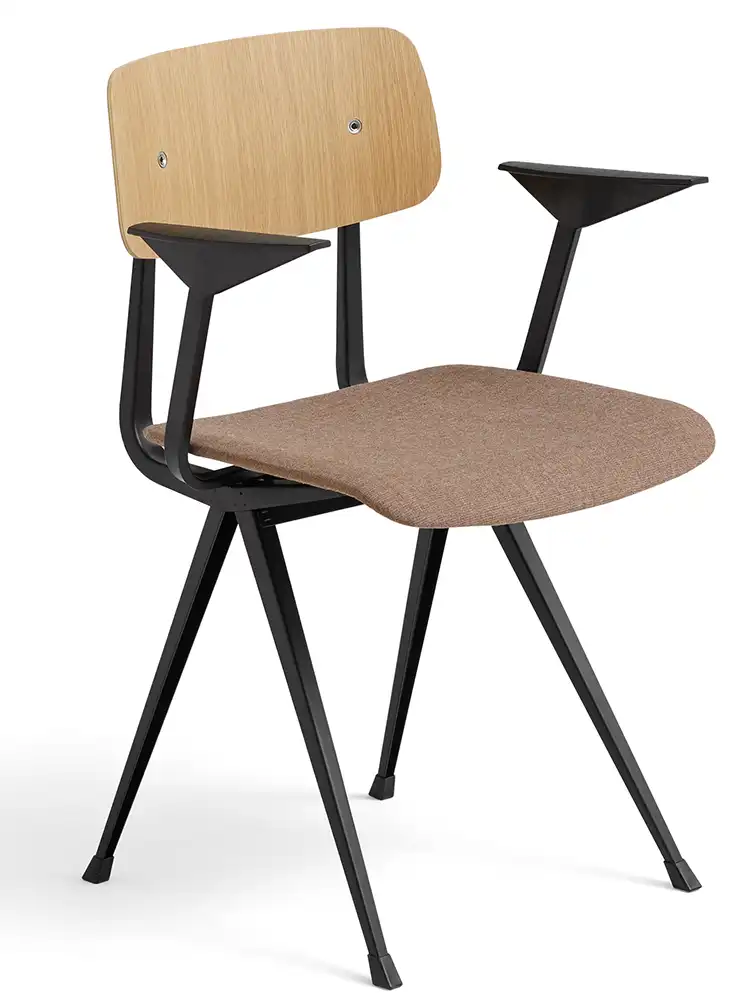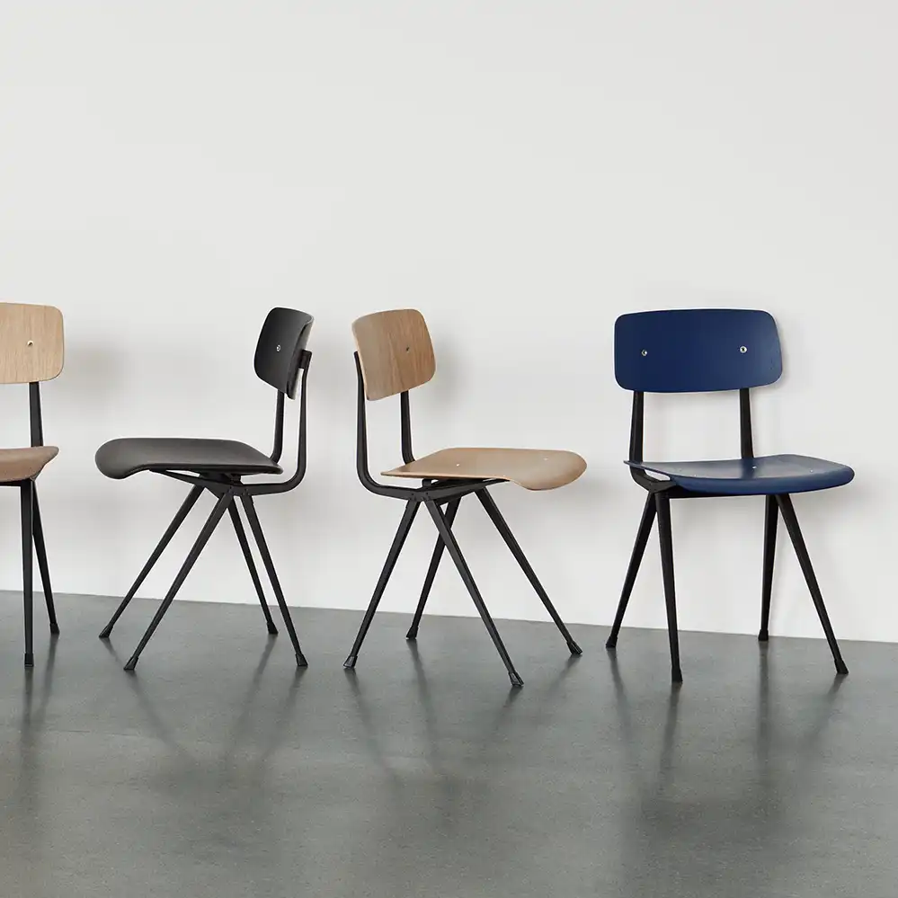 Der Result Arm Chair wurde 1958 von Friso Kramer und Wim Rietveld für die niederländische Manufaktur De Circel entworfen. Ähnlich wie bei Jean Prouvé, zeichnet sich der Stuhl durch einen Rahmen aus gebogenem Metallblech aus. Seit 2014 wurden die Sitzmöbel von HAY neu aufgelegt und sind heute in zahlreichen Varianten und Farben erhältlich.