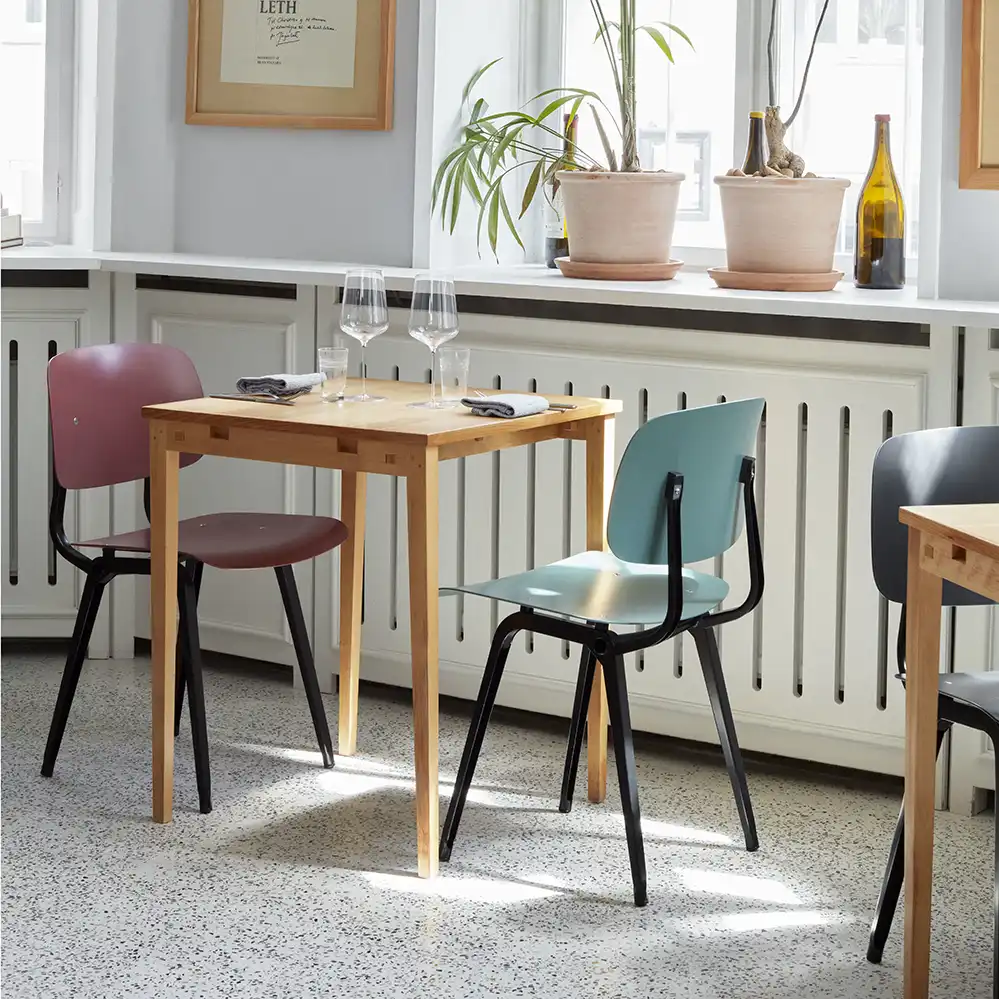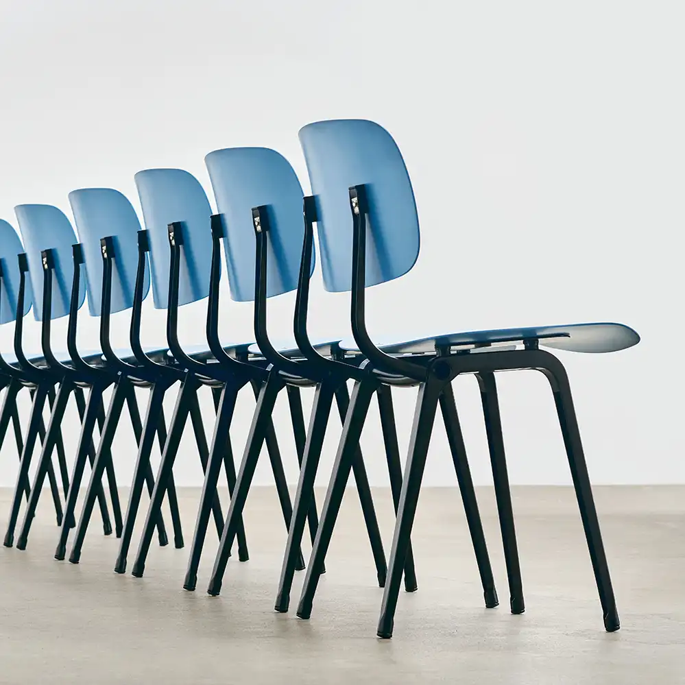 Den Revolt Chair entwarf der niederländische Industriedesigner Friso Kramer ursprünglich im Jahr 1953, der Entwurf gilt als eine der besten Arbeiten des holländischen Mid Century Designs und wurde in großen Stückzahlen produziert. Ab 1993 wurde der Stuhl zuerst von Ahrend wieder produziert, seit 2014 dann von HAY.