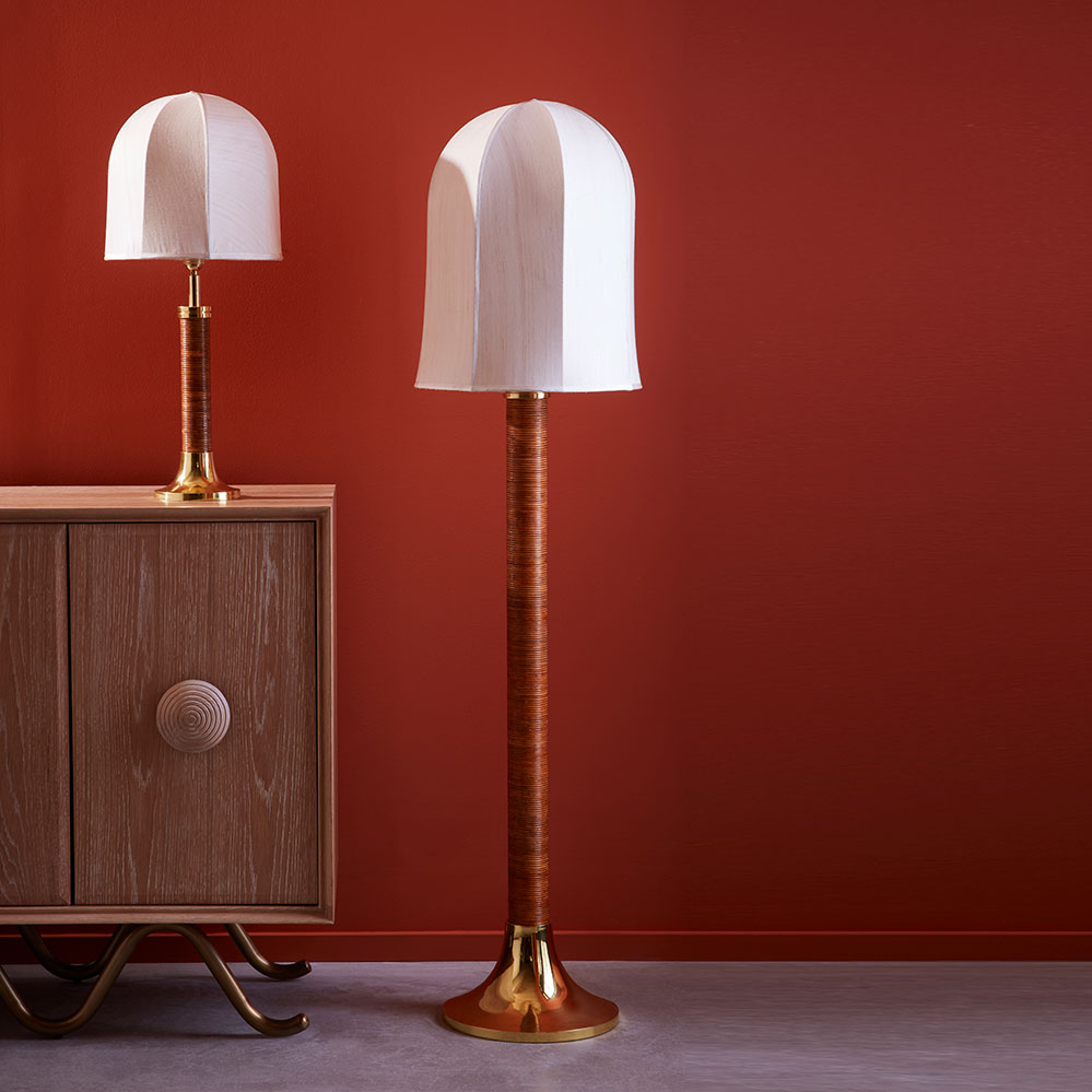 Die Riviera Dome Floor Lamp Stehleuchte aus Rattan und Messing von Jonathan Adler erinnert an vergangene Epochen. Naturmaterialien wie Rattan oder Kork erfreuen sich aktuell großer Beliebtheit und werden von verschiedensten Designern und Herstellern wieder gerne verwendet. Zusätzlich ist die Leuchte optional als Tischleuchte erhältlich.
