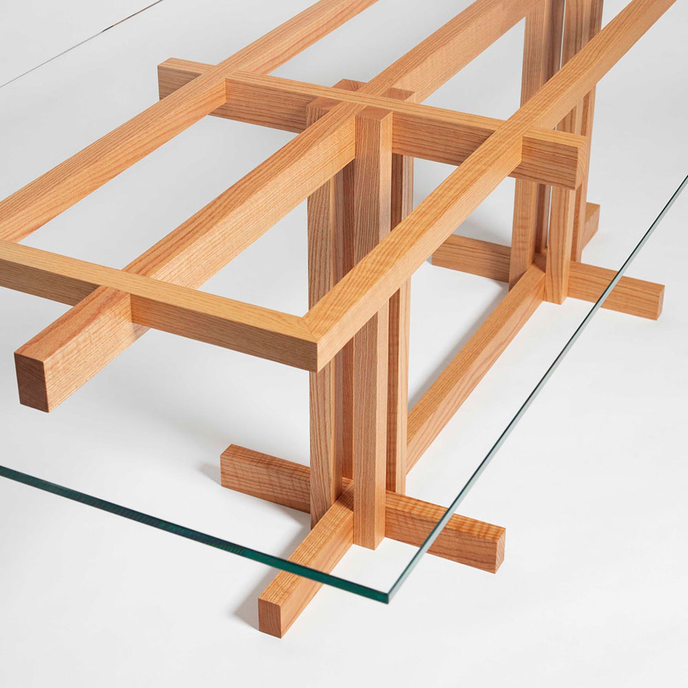 - Tischplatte Glas, Gestell Roteiche massiv, geölt