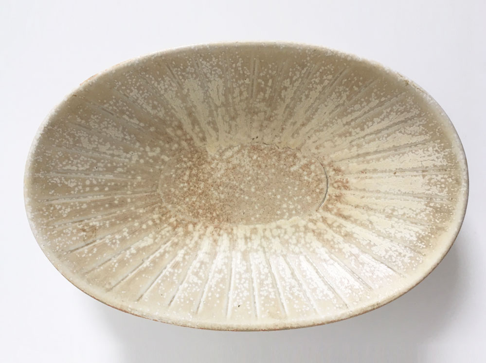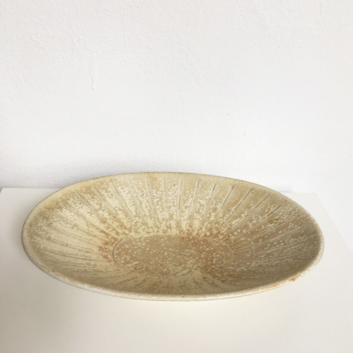 Die große, ovale Steingutschale ist ein Entwurf von Gunnar Nylund für die schwedische Manufaktur Rörstrand.