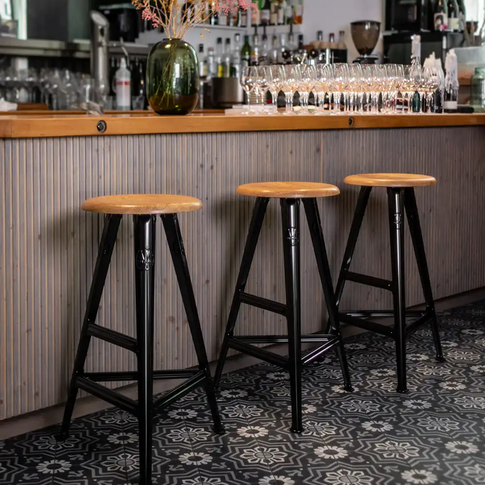 Der Rowac-Barhocker mit einer Stzhöhe von 75 cm ist eine Variante des klassischen Schemels mit 50 cm Höhe und verfügt über eine extra Fußablage. Der dreibeinige Designklassiker aus dem Jahr 1909 wird mit verschiedenen Hölzern für die Sitzfläche - wie hier in geölter Eiche - produziert.