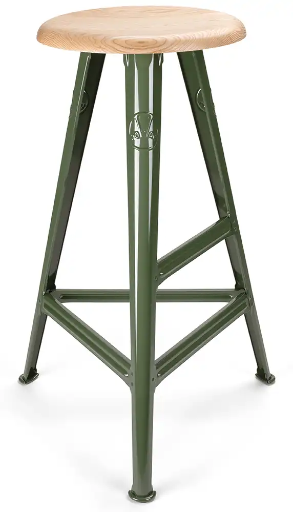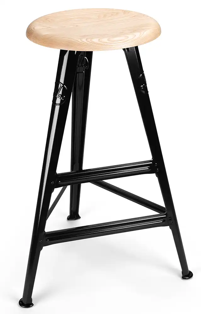 Der Rowac-Barhocker 75 ist eine Adaption des klassischen Schemels. Der dreibeinige Designklassiker wird mit verschiedenen Hölzern für die Sitzfläche - wie hier Version in Esche produziert.