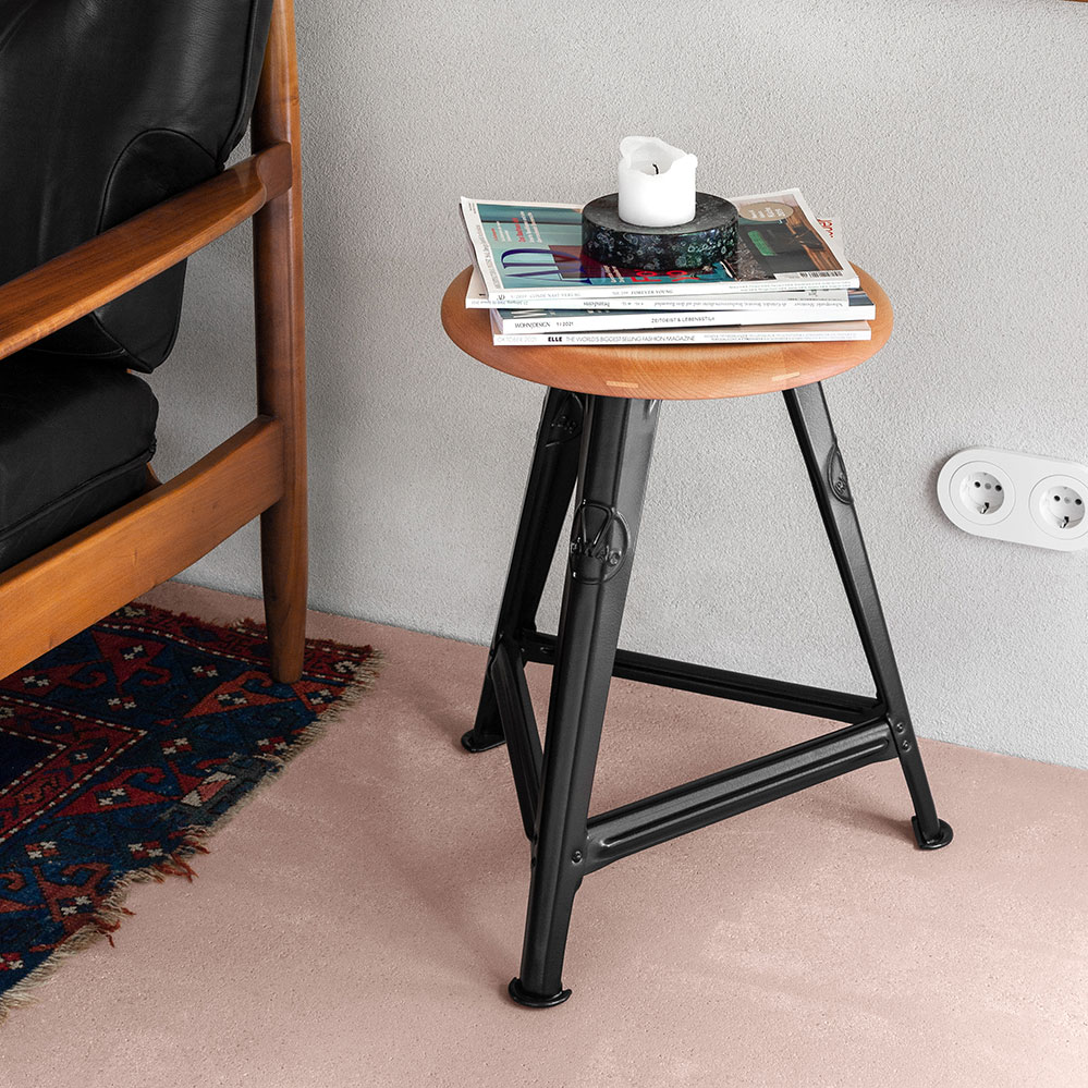 Seit 2024 ist der berühmte Rowac Hocker wieder erhältlich. Der dreibeinige Schemel aus dem Jahr 1909 wird mit verschiedenen Hölzern für die Sitzfläche - wie hier in schwarz gebeizter Esche - von Rowac aus dem Erzgebirge wieder angeboten.