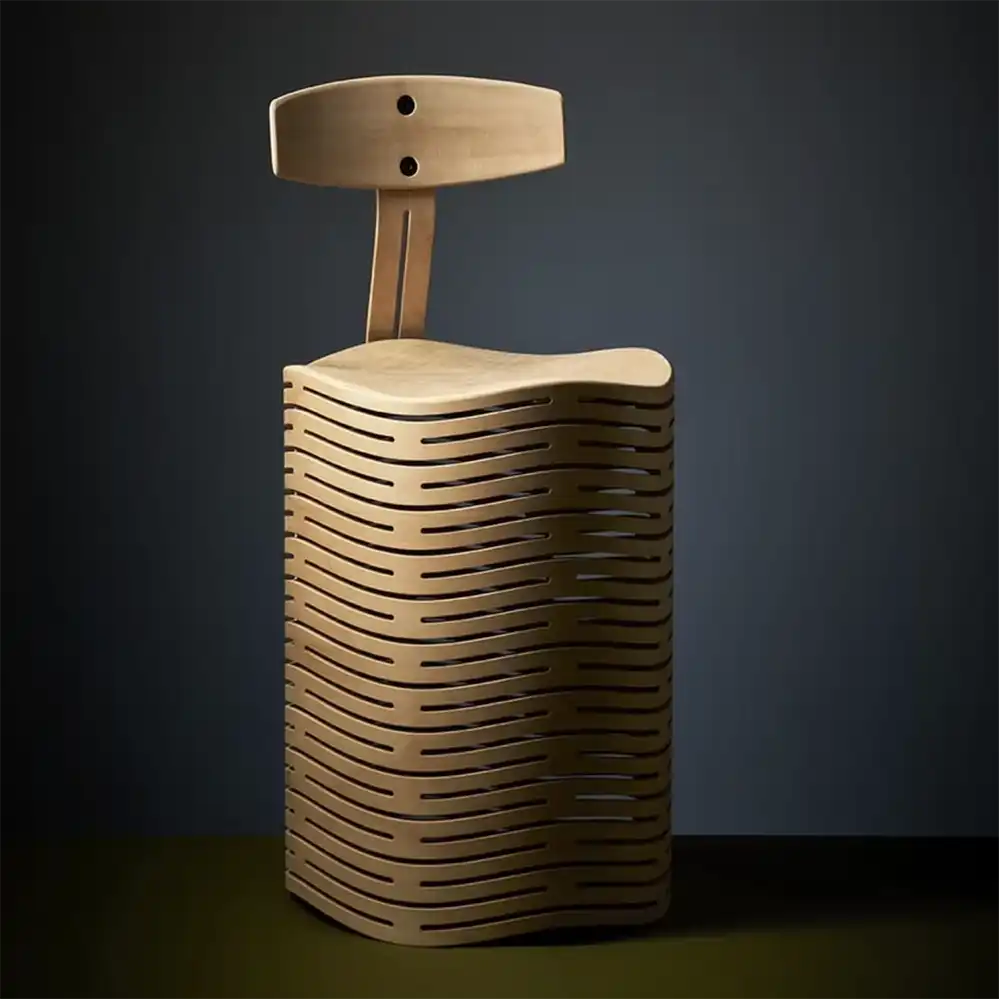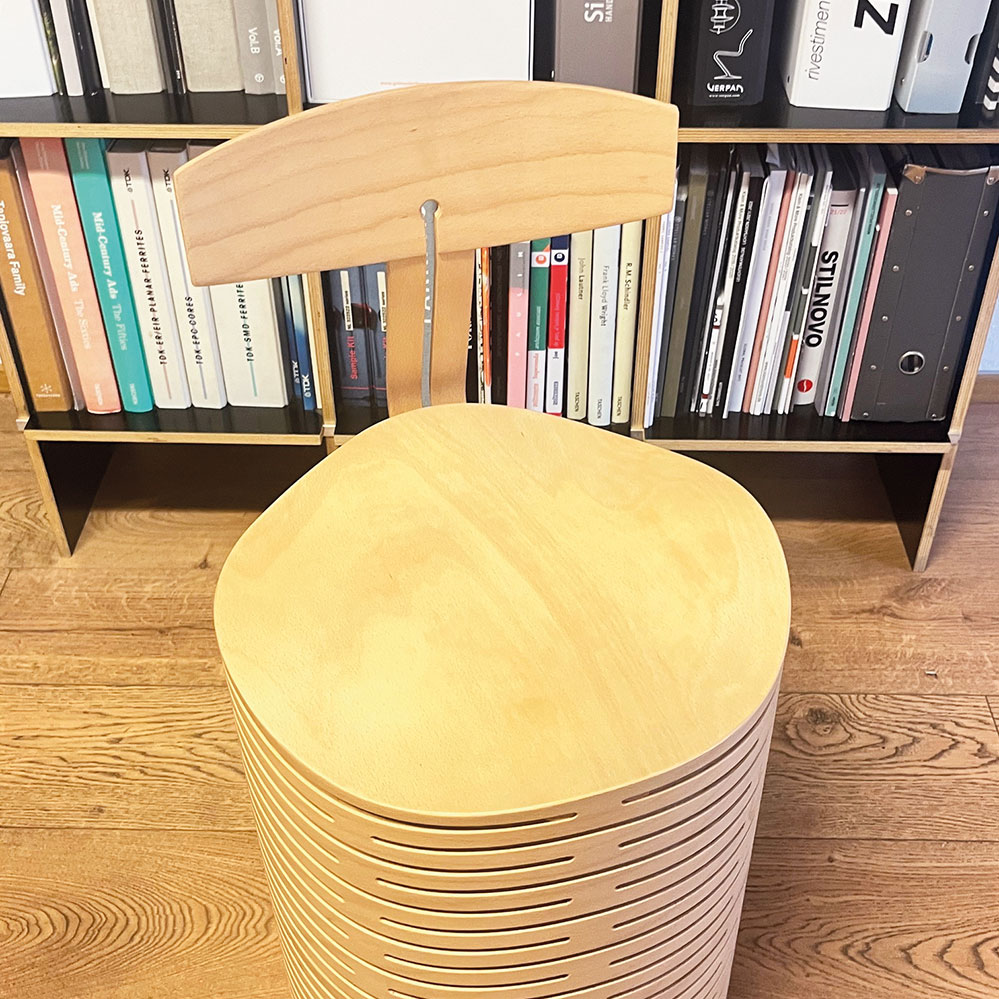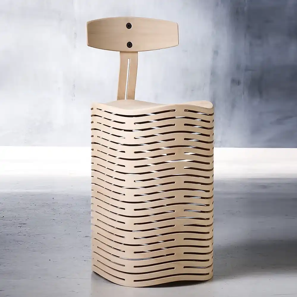 Der Ruwig Hocker ist optional mit einer Rückenlehne erhältlich, die mit wenigen Handgriffen abgebaut werden kann. Im Gegensatz zu den ersten zwei Fotos kommt die Serienfertigung von Chris Ruhe nun ohne Schrauben aus. 15 Jahre nach der Erfindung der wellenhafte Verformung für den Hocker, ist er Ruwig Hocker ein ergonomisches Sitzmöbel für rückengeplagte Büromenschen.