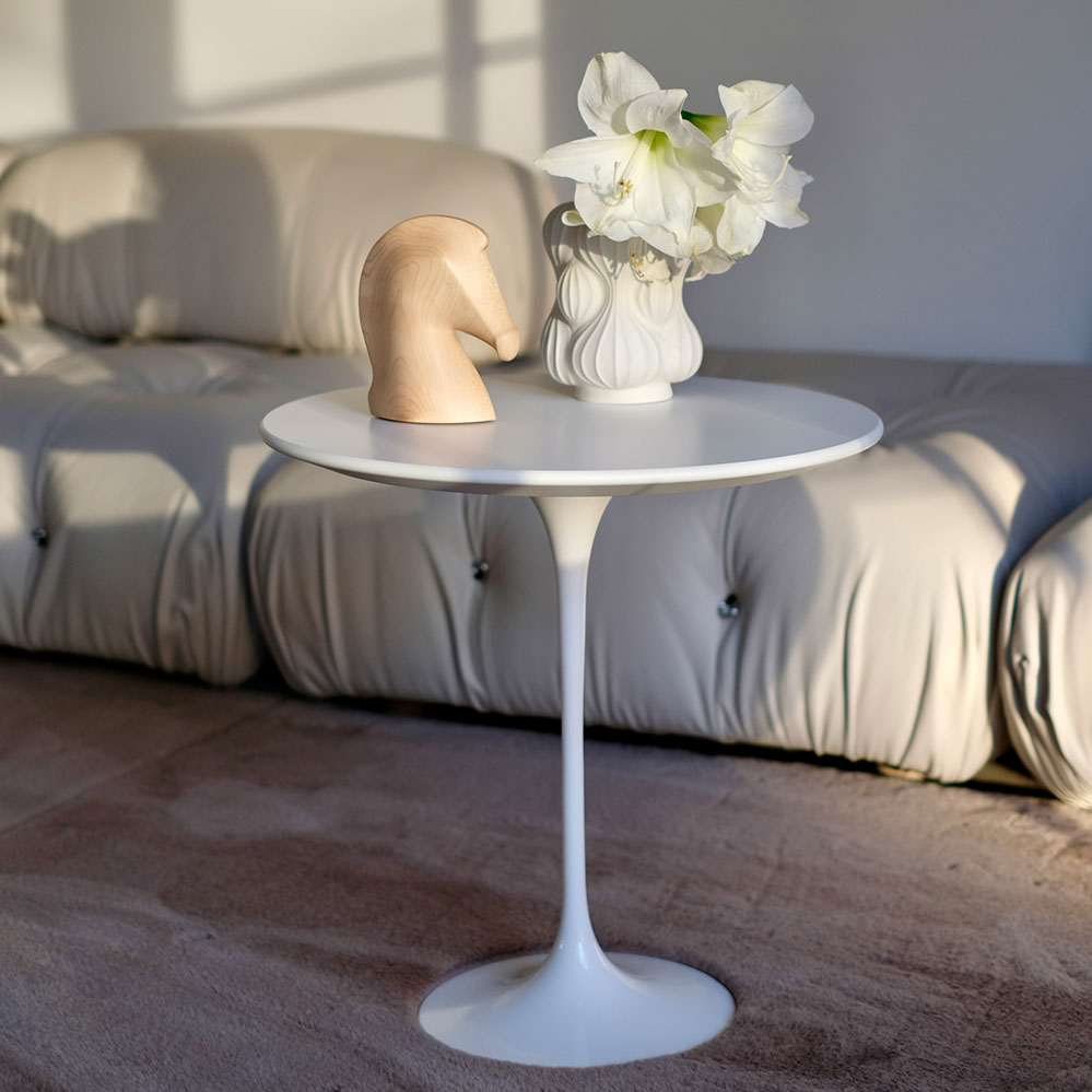 Der hier angebotene Saarinen Tulip Beistelltisch von Knoll hat einen Durchmesser von 51 cm. Mit seinen Entwürfen für eine einbeinige Möbelserie gelang Eero Saarinen sein bekanntester Entwurf. Erstmalig wurde ein Stuhl mit nur einem Bein hergestellt – und passend dazu eine ganze Serie verschiedener Tische. Der Tulip Tisch ist mit verschiedenen Tischplatten erhältlich, von denen wir eine Auswahl anbieten. Der Tischfuß ist wahlweise weiß oder schwarz beschichtet.