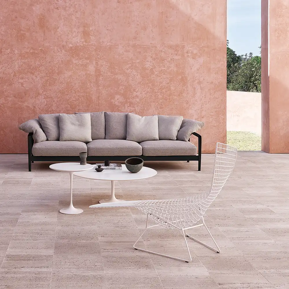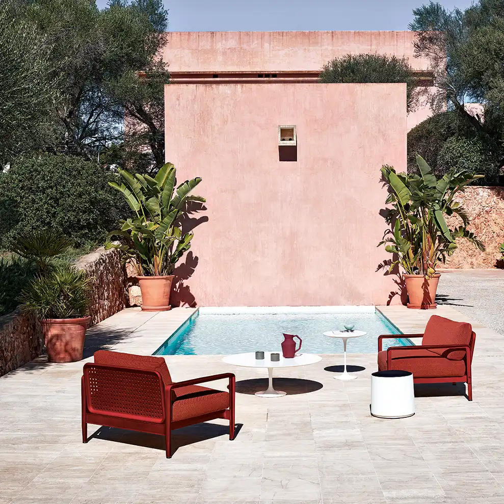 Als Bestandteil der Knoll Gartenkollektion ist der Saarinen Beistelltisch als Outdoor-Variante erhältlich. Der Tisch mit einer 51 cm großen, wettertauglichen Acrylsteinplatte ist dabei in den zwei Höhen 36 cm und 51 cm bei Knoll Internatioanl lieferbar.