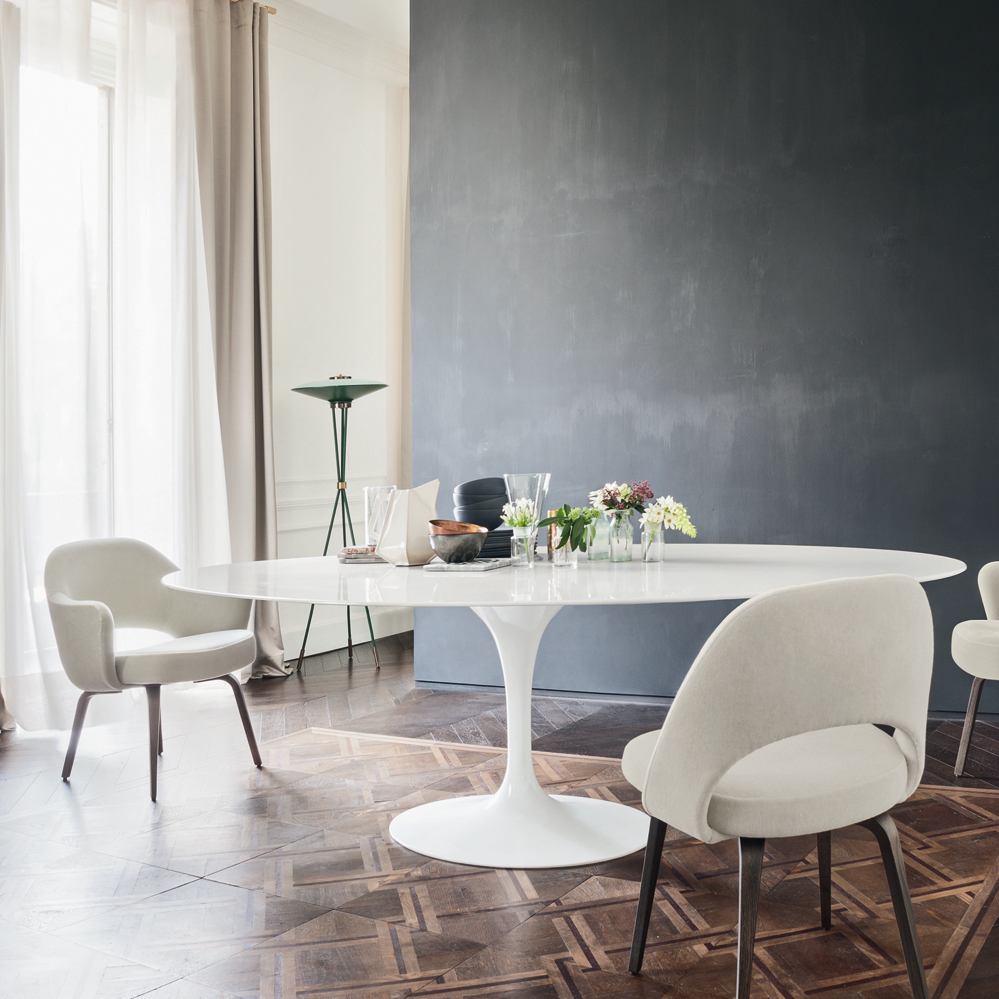 Der Saarinen Armlehnstuhl 71 ist wahlweisemit deinem Gestell aus Stahlrohr oder - wie hier angeboten- mit einem Holzgestell erhältlich, die Füße sind wahlweise Eiche natur, oder auf Nussbaum und Ebenholz gebeizt. 1950 entwarf Eero Saarinen für Knoll den Armlehnstuhl 71, der Knoll Produktname „Conference Chair” ist etwas verwirrend, der Saarinen Stuhl kann selbstverständlich ebenso als Esszimmerstuhl verwendet werden. Das Konzept des Stuhls basiert dabei auf dem Organic Chair, den Eero Saarinen gemeinsam mit seinem engen Freund Charles Eames im Jahr 1940 entwickelte. Saarinen führte nach dem Krieg diese Ideen weiter aus und schuf für Knoll einen erfolgreichen Sitzklassiker für den Privat- und Geschäftsbereich. Erhältlich ist der Conference Arm Chair 71 bei Markanto in ausgewählten Stoffen, die Preise weiterer Stoffarten oder in Leder teilen wir Ihnen gerne auf Anfrage mit.