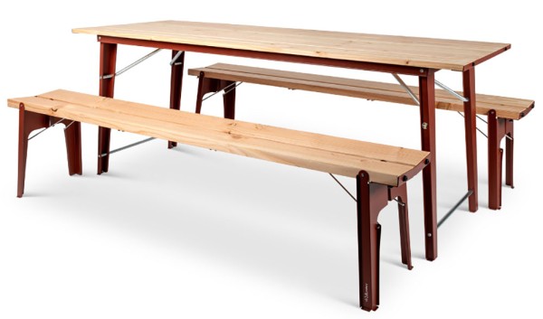 Die Salut Biertischgarnitur, bestehend aus Tisch und zwei Bierbänken, ist die moderne Interpretation des Sitzklassikers aller Volksfeste und Jahrmärkte. Dabei besteht bei den Salut Bierbänken endlich mal keine Sitzgefahr, da die Beine ganz außen angeordnet sind. Auch ist Sitzfläche um 7 Grad nach innen geneigt ist und die Beine sind leicht angewinkelt, wodurch die Salut Bierbank besonders stabil wird. Zu der stabilen Bierbank gehört ein ebenso stabiler Biertisch, dieser verfügt über einen integrierten Flaschenöffner an der Unterseite der Tischplatte. Alle Möbel sind natürlich, wie es sich gehört, klappbar.