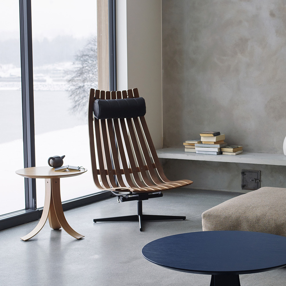 Im Rahmen eines Studentenprojekts am National College of Art & Design in Oslo entwarf Hans Brattrud ursprünglich das erste Modell des Stuhls. Der Entwurf war damals in Form und Ausdruck revolutionär. Durch die Kombination von horizontalen und vertikalen Holzlatten entstand eine organische Schichtholzschale - eine simple, aber geniale Konstruktion. Vielfach ausgezeichnet, wurde der Stuhl ein Designklassiker aus Norwegen, wo damals nur wenige Entwürfe entstanden.