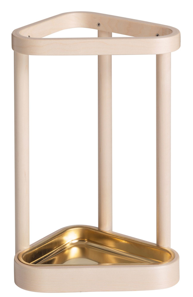 Der finnische Architekt Alvar Aalto entwarf den Schirmständer 115 aus Birkenschichtholz im Jahr 1936, der innenliegende Messing-Einsatz schützt den Boden vor Feuchtigkeit. Erhältlich ist der Schirmständer aktuell in Birke natur, klar lackiert.