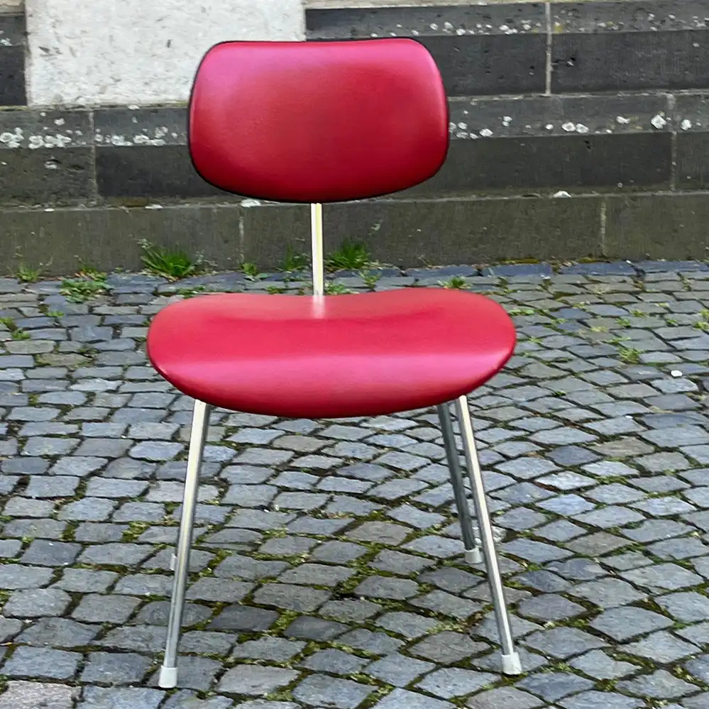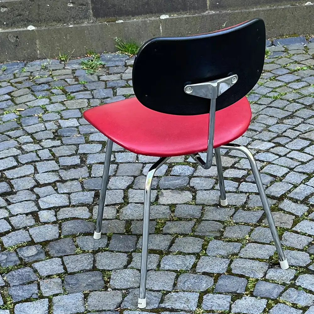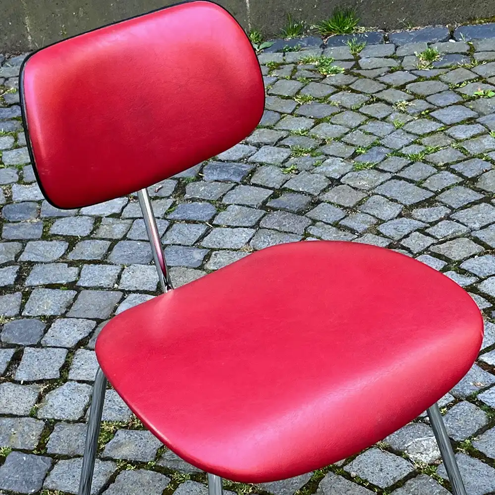 - Sitz und Rücken mit einem roten Kunstleder bezogen, Gestell verchromt