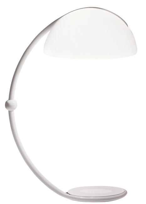 Die Leuchten der Serpente Serie von Elio Martinelli zeichnen sich durch ihren drehbaren Schirm aus. Noch heute werden die Tisch- und Stehleuchte von der von ihm gegründeten Firma Martinelli luce produziert. Als Material für seine Leuchtenentwürfe setzte Martinelli häufig den Kunststoff Methacrylat ein, das opale Material verleiht den Serpente Leuchten eine transparente Anmutung und sorgt für ein warmes Licht. Der Schirm der Serpente Stehleuchte lässt sich durch das Kugelgelenk beliebig drehen, wodurch dieser Entwurf zum italienischen Klassiker der 1960er Jahre wurde.