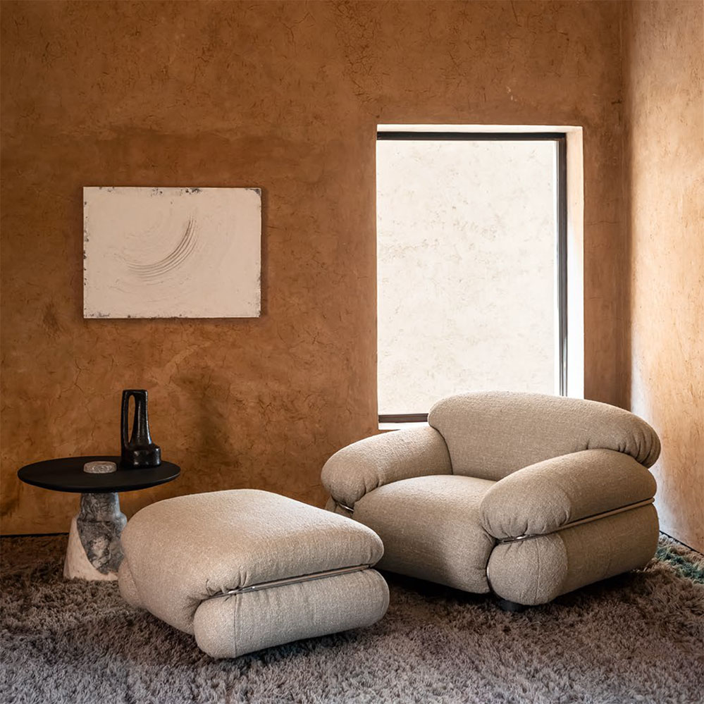 Das Sitzprogramm Sesann entwarf der italienische Architekt Gianfranco Frattini im Jahr 1970. Neben dem Sessel ist das passende Sesann Sofa in den zwei Längen 180 cm und 240 cm erhältlich. Die aufgeführten Preise des Sessels sind wahlweise für Stoff oder das hochwertige Anilinleder von Tacchini.