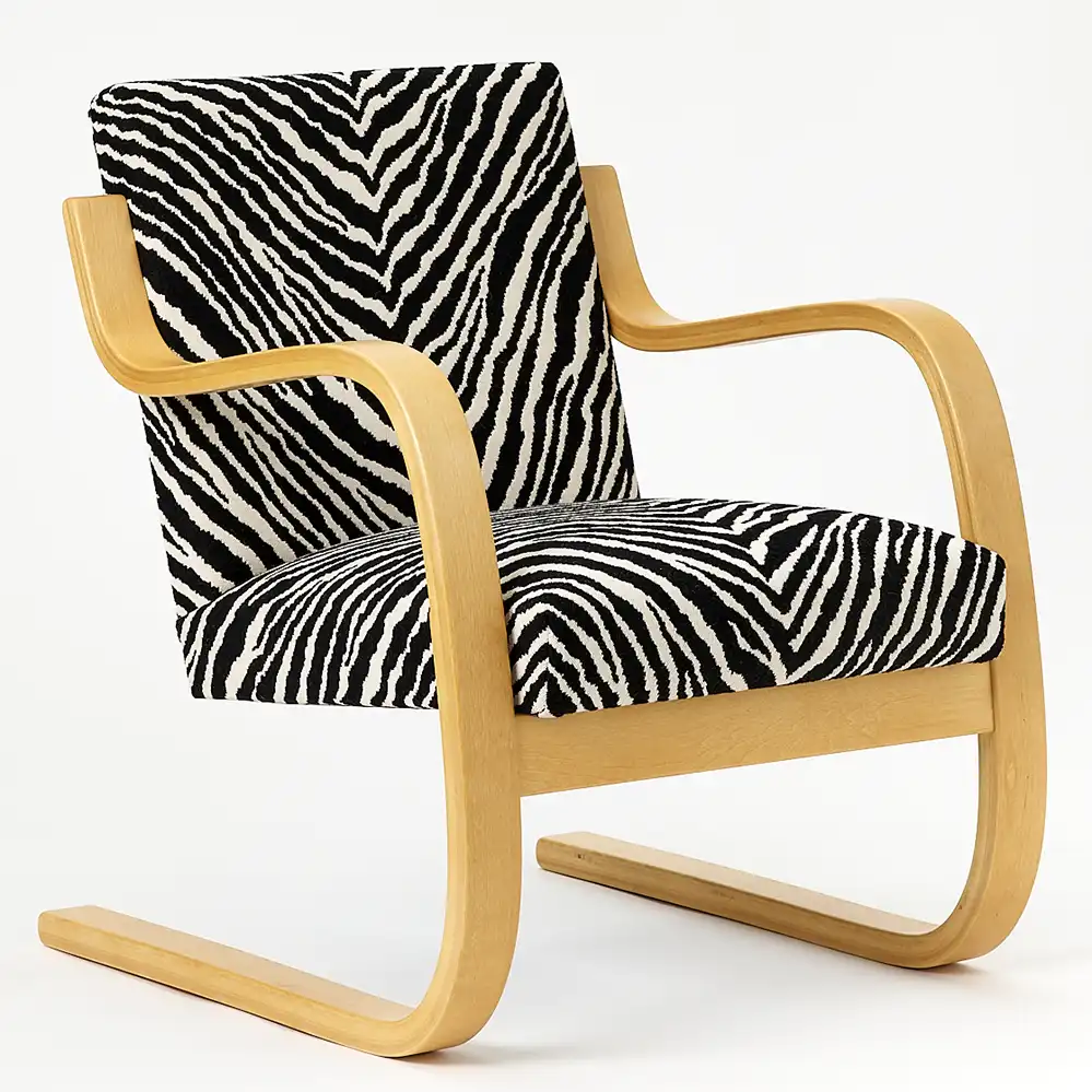 Artek Freischwinger 402 / Arm Chair 402 von Alvar Aalto: Variante mit Zebra-Stoff
