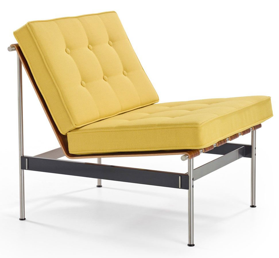 Inspiriert von Florence Knoll Parallel Bar Möbelserie aus den 1950er Jahren schuf der niederländische Architekt Kho Liang le 1960 seine eigene, sehr schöne Interpretation. Denn im Gegensatz zum Knoll Modell verfügt seine Serie 416 über eine höchst dekorative rückseitige Tragschale aus Eiche oder Palisander, wodurch die Möbel ideal für eine Positionierung mittig im Raum geeignet sind. Das Stahlgestell bildet dabei einen räumlichen Kasten, auf dem der Sitzende auf den bequemen Sitzkissen ruht. Erhältlich ist der Sessel 416 bei Markanto in dem typischen Mid Century Stoff Amdal des norwegischen Stoffherstellers Gudbrandsdalens in zahlreichen Farbtönen (selbstverständlich ist der holländische Designklassiker noch in anderen Stoffen oder in Leder erhältlich, wir freuen uns auf Ihre Anfrage).