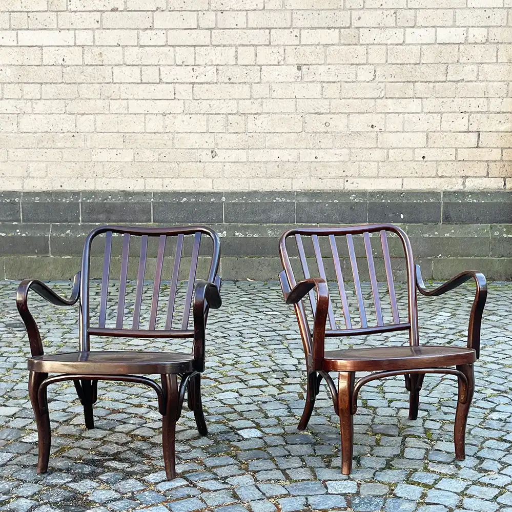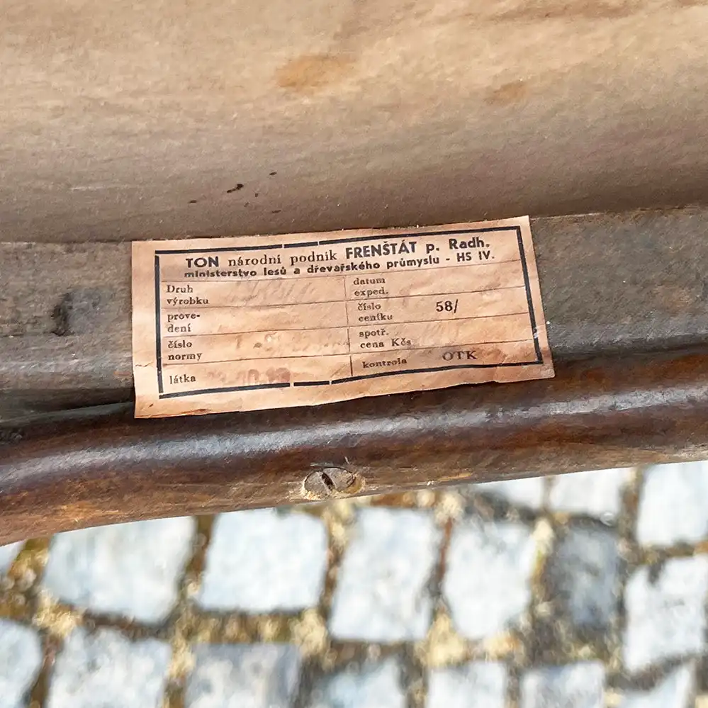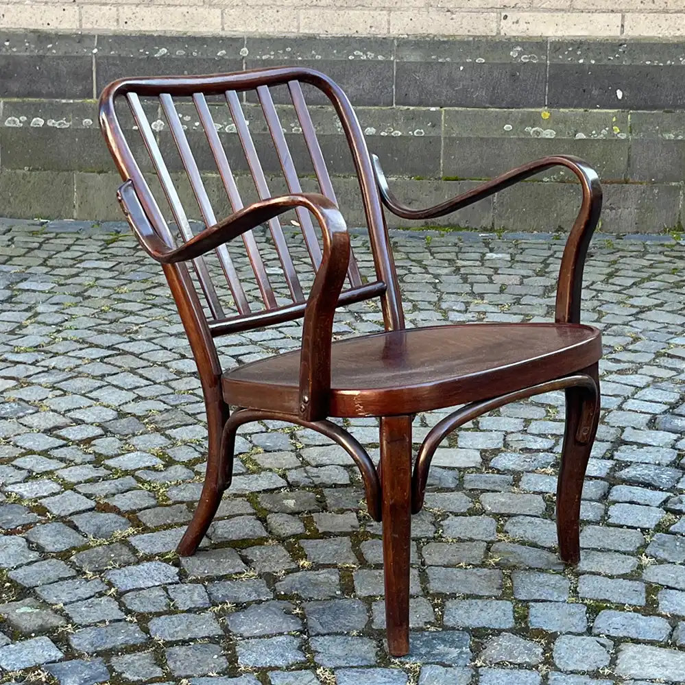 In den 1930er Jahren entwarf Josef Frank den Bugholzsessel 672 für Thonet. Unsere zwei Exemplare stammen von der kommunistischen Tageszeitung „Lidová Demokracie” in Prag und wurden von TON in den 1950er Jahren hergestellt. Die Firma TON entstand wohl nach dem Zweiten Weltkrieg und nutzte das ursprüngliche Thonet Werk in Bystřice pod Hostýnem. Zwei Stühle verfügbar, Preis pro Exemplar.