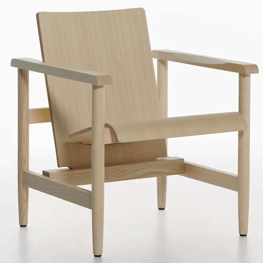 Der Sol Lounge Chair ist ein kompakter, leichter Sessel, entworfen von Konstantin Gricic 2025 mit einer aktiven, niedrigen Sitzhaltung. Sitz und Rückenlehne aus Formsperrholz greifen ineinander und ermöglichen eine flexible Rückenstütze. Gefertigt ist Sol aus massivem Eschenholz, mit vertikalen Beinen und klar horizontalen Armlehnen, die dem Stuhl eine offene, aufgeräumte Erscheinung verleihen. Feine Details wie leicht zulaufende Füße und eingearbeitete Armlehnen betonen die handwerkliche Verarbeitung. SOL ist in naturbelassener oder farbig gebeizter Ausführung erhältlich.