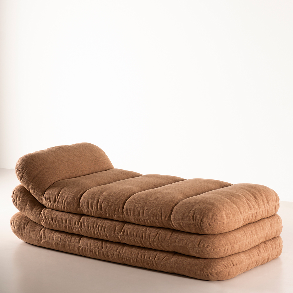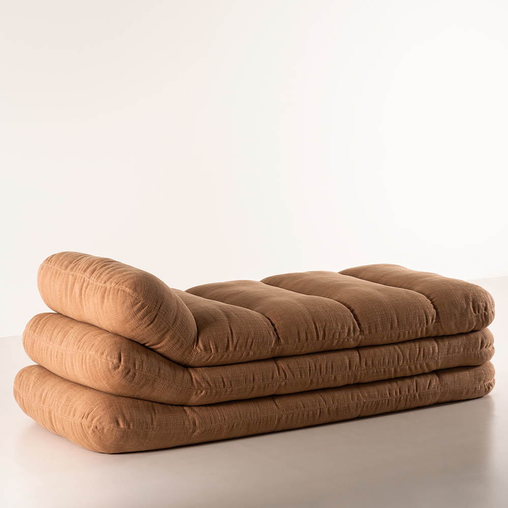 Das Solar Daybed ist Bestandteil der Cosmic Kollektion, die Tacchini 2024 in Mailand als Kooperation zwischen Toogood und der italienischen Manufaktur vorstellte. Das fett gepolsterte Sitzmöbel soll wie ein Haufen Kissen wirken. Mit ihrer charakteristischen Mischung aus Witz und Stil lädt Faye Toogood zu einer Landung auf diesem Möbel ein. Solar kombiniert skulpturale Formen mit Weichheit und bietet eine neue Interpretation von Tacchinis ikonischen Polstermöbeln. Der Stoff ist absichtlich zerknittert, um den Sitzmöbeln eine großzügige Wölbung zu verleihen. „Ich versuche, so viel von mir selbst und meiner Energie in die Objekte zu stecken. Die Form von Solar entstand, als ich meine Finger in eine Tonpuppe drückte und die drei Schichten zusammendrückte.“ so Faye Toogood über den Entwurf.