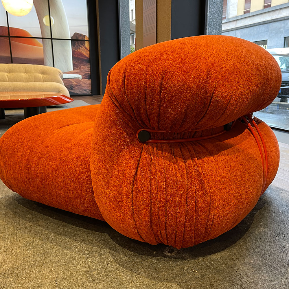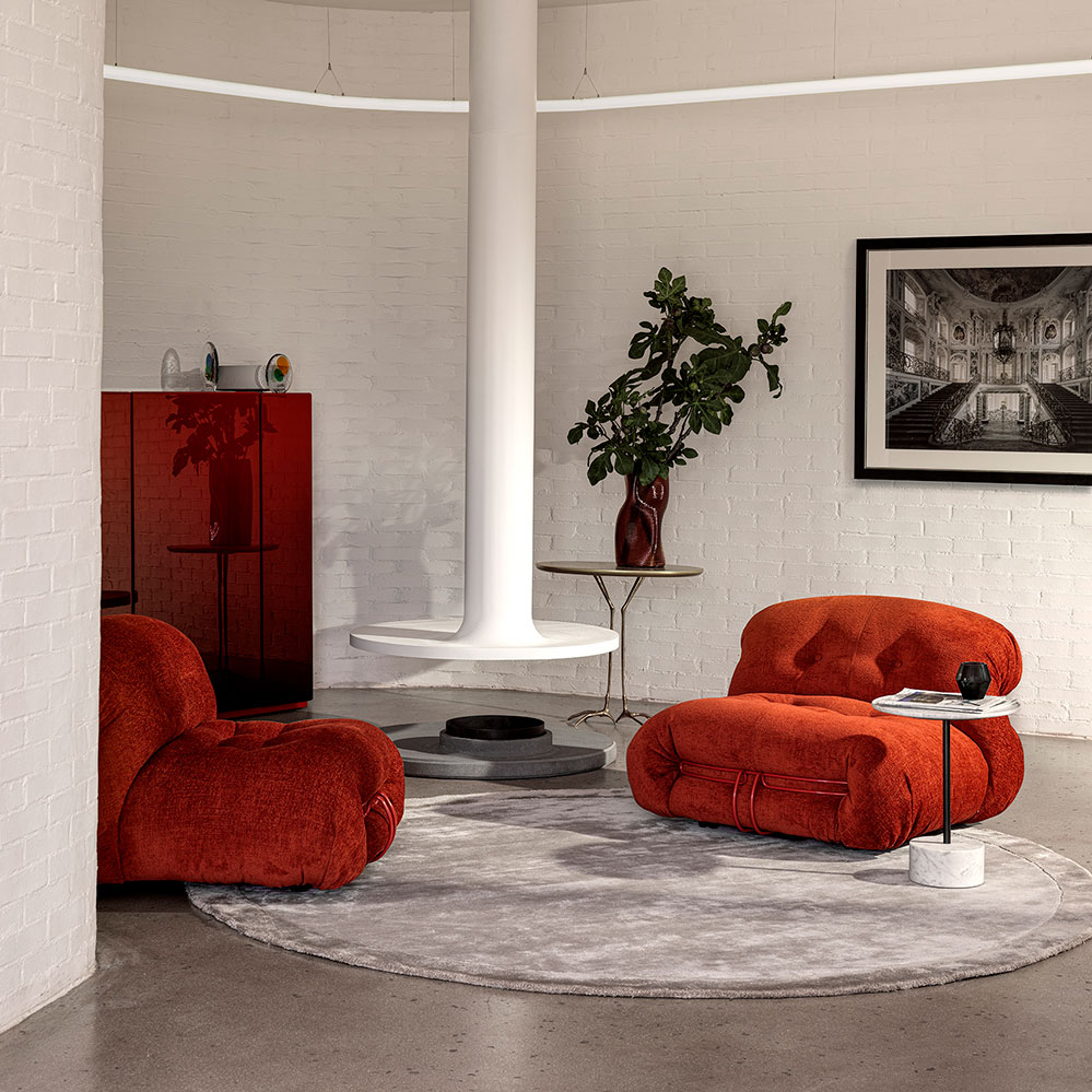 1969 entwarfen Afra und Tobia Scarpa für Cassina das Sitzmöbelprogramm Soriana, bestehend aus Sessel und Sofa, der Entwurf wurde 1970 direkt mit dem Compasso d’Oro Preis ausgezeichnet. Dabei wird die opulente Polsterung aus recyceltem Polyethylen durch Metallbügel in Form gehalten. 2021 wurde der italienische Klassiker von Cassina neu aufgelegt.