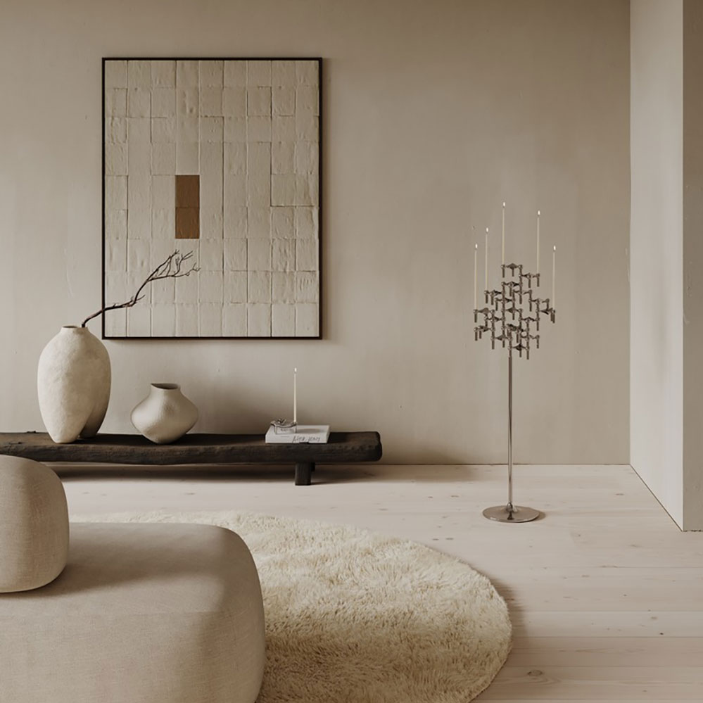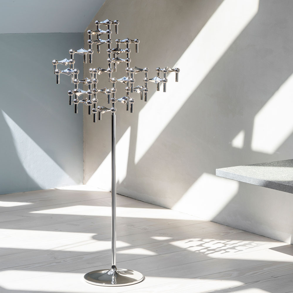 Ursprünglich für die Firma Nagel in Köln entwarf der deutsche Architekt Werner Stoff in den 1960er Jahren den Kerzenständer als ein Stecksystem. Denn das einzelne Element kann beliebig ergänzt und zusammengesteckt werden - so lassen sich ganze Skulpturen formen. Die Grundidee zu dem Entwurf kam Werner Stoff unseres Wissens durch Spuren im Schnee. Der deutsche Designklassiker wurde so bekannt, dass er immer noch allgemein als Nagel Kerzenständer bezeichnet wird. Die heutige Reedition wird von der Firma Stoff Copenhagen in Dänemark unter der Bezeichnung Stoff Kerzenständer produziert. Die Lieferung erfolgt in einer Geschenkbox, die die damalige Entwurfszeichnung zeigt.