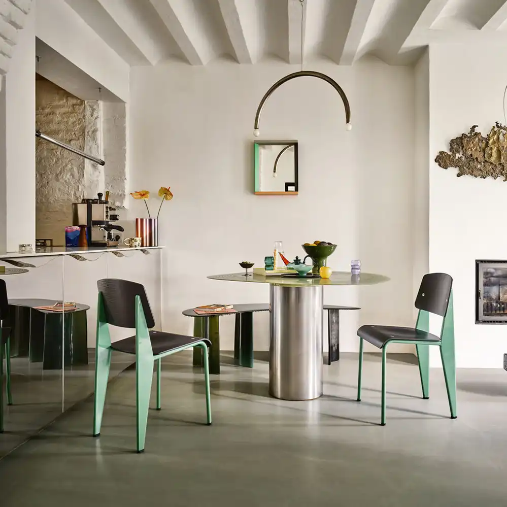 Der Standard Chair von Jean Prouvé mit seinen konstruktiv verstärkten Hinterbeinen zählt zu den wichtigsten Designklassikern der Möbelgeschichte. Entworfen wurde der Stuhl bereits in den 1930er Jahren, die heute von Vitra hergestellte Edition basiert auf Prouves später überarbeitetem Entwurf aus dem Jahr 1950.