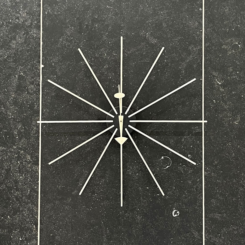 Die 61 cm große Wanduhr Star Clock von Vitra ist ein Entwurf des George Nelson Office aus dem Jahr 1955. Die einzelnen zwölf Speichen bestehen abwechselnd aus Messingstäben und verchromten Metallstäben. Das letzte Foto zeigt übrigens eine historische Star Clock von Howard Miller in der Lobby des Mannesmann Hochhaus in Düsseldorf aus den 1950er Jahren, vermutlich die einzige Wanduhr in Europa. Nach unseren Informationen hatte der Architekt des Hochhauses, Paul Schneider-Esleben, diese Uhr extra in Amerika bestellt.