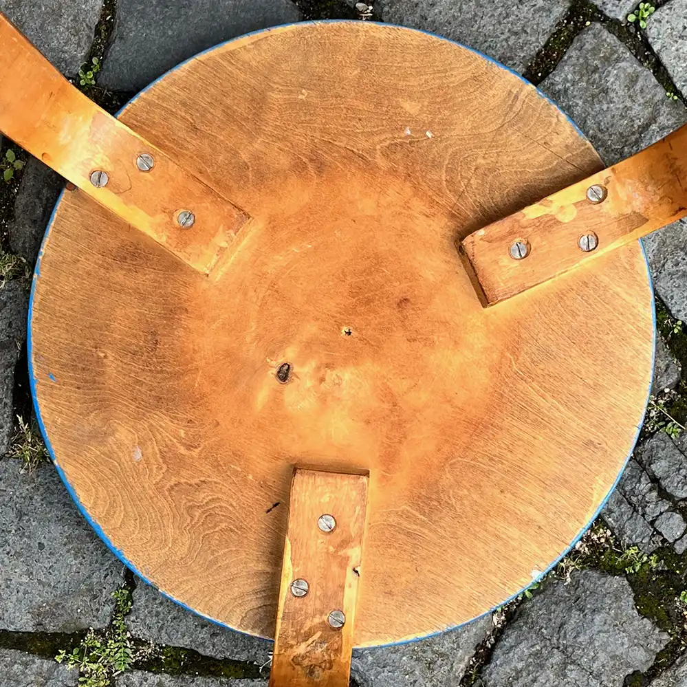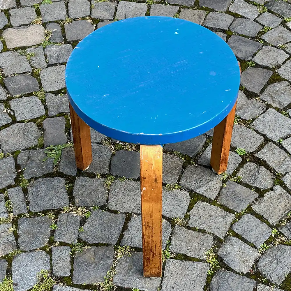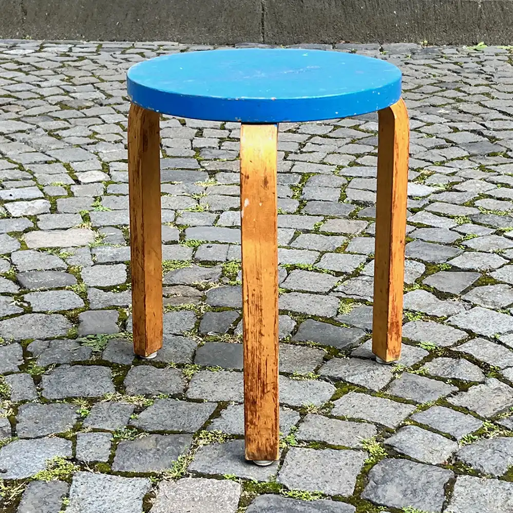 Dieser Hocker 60 von Alvar Aalto befindet sich zwar in einem „Shappy Chic”-Zustand, stammt dafür aber noch aus den 1930er der O.y. Huonekalu-ja Rakennustyötehdas AB Produktion in Finnland, erkennbar an den alten Schlitzschrauben auf der Unterseite sowie den vier Schlitzen zur Verformung der Birkenbeine.