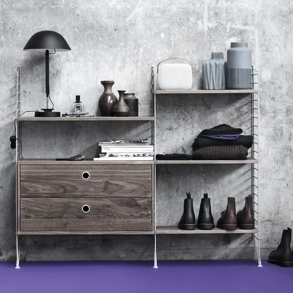 Das String Regal ist ein Entwurf des schwedischen Ehepaars Kajsa und Nils Strinning von 1949, der sich heute immer noch größter Beliebtheit erfreut. Im Rahmen eines Wettbewerbs des schwedischen Buchverlages Bonniers folkbibliotek gewannen sie damals direkt den ersten Preis für seinen Entwurf. Denn String erfüllte alle Kriterien: preiswert, einfacher Versand und unkomplizierte Montage.