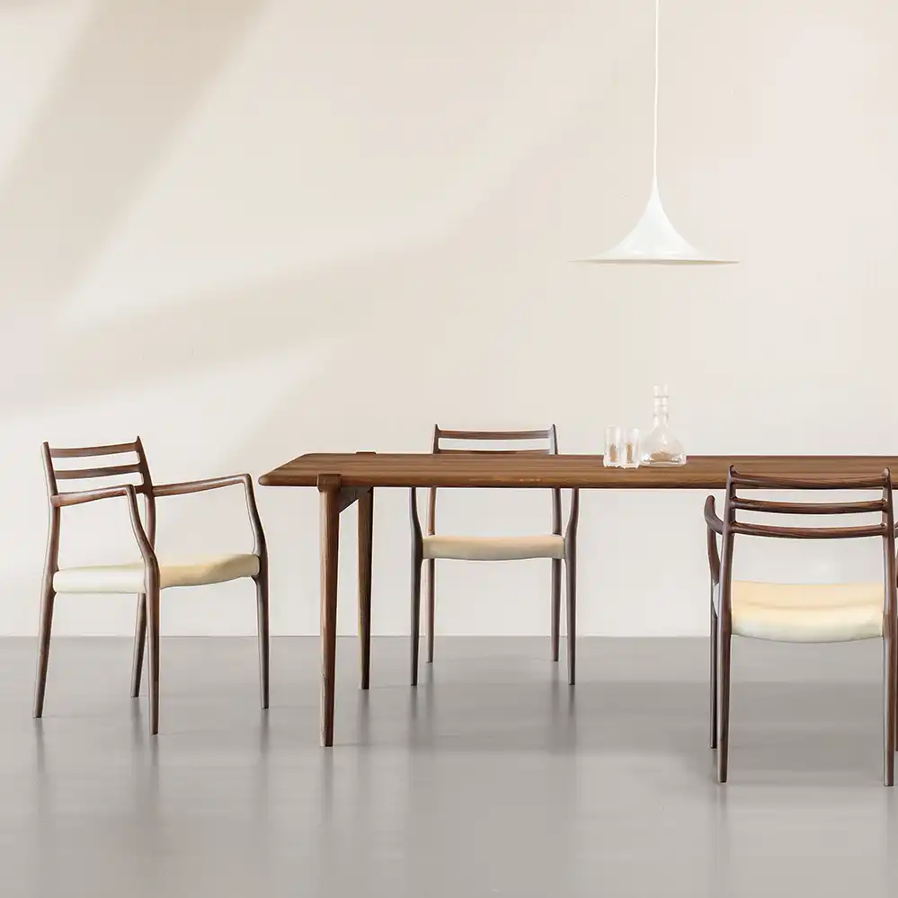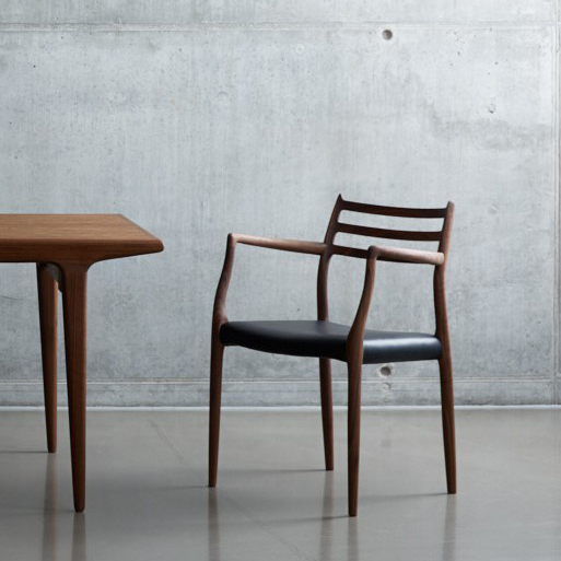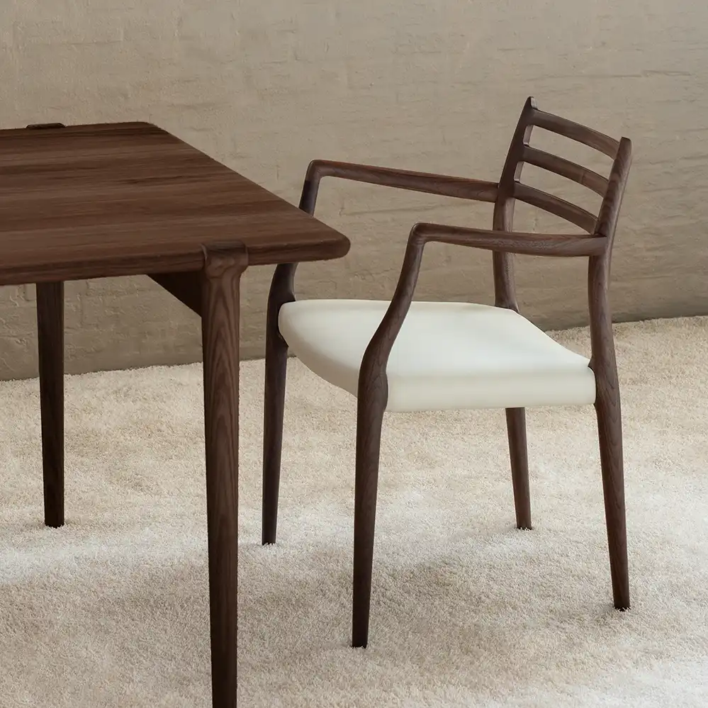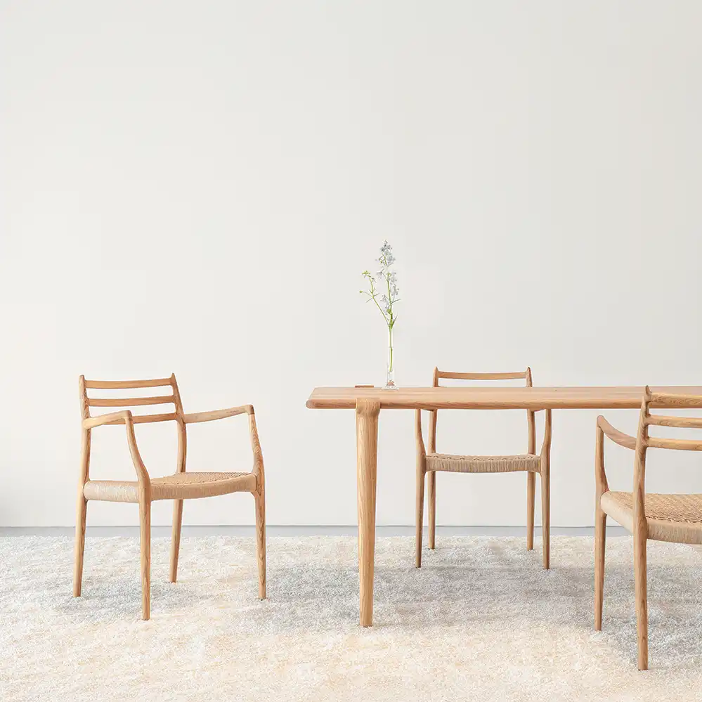 1962 entwarf Niels Otto Møller den skulpturalen Armlehnstuhl 62, das Pendant ohne Armlehnen ist das Modell 78. Erhältlich ist der Stuhl bei Markanto als Standard wahlweise mit einer Sitzfläche aus Papiergeflecht oder mit Leder. Varianten mit einem Stoffbezug in Hallingdalbieten wir Ihnen gerne auf Anfrage extra an!