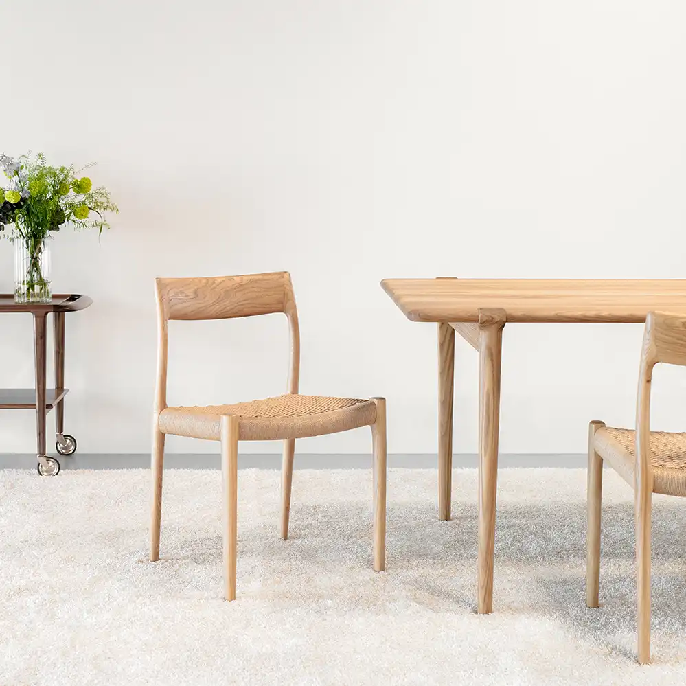 Den Stuhl 77 entwickelte der dänische Designer Niels Otto Møller 1959 für seine eigene Firma J.L. Møllers Møbelfabrik, die Variante als Armlehnstuhl ist das Modell 57. Erhältlich ist der Stuhl bei Markanto als Standard wahlweise mit einer Sitzfläche aus Papiergeflecht oder mit Leder. Varianten mit einem Stoffbezug in Hallingdal von bieten wir Ihnen gerne auf Anfrage extra an!