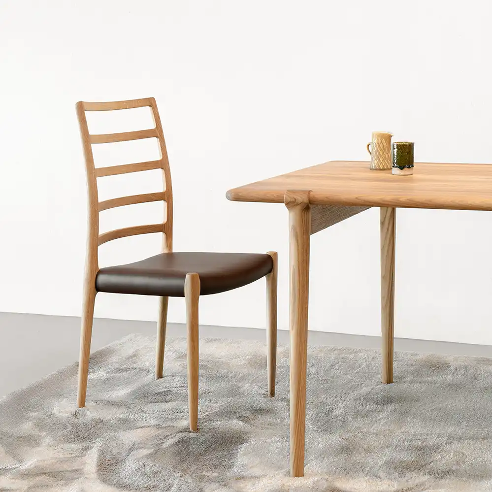 Der 1970 von J.L. Møller entworfene Stuhl Modell 82 ist durch seine hohe Rückenlehne und präzise Verarbeitung international bekannt – insbesondere als „Embassy Chair“, da er weltweit in diplomatischen Einrichtungen eingesetzt wird. Die Neuauflage ist bei Markanto in Eiche oder amerikanischem Nussbaum sowie wahlweise mit einer Sitzfläche aus Papiergeflecht oder mit Leder erhältlich.