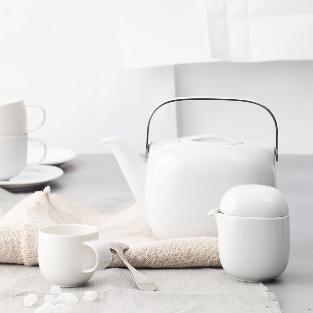 - 21-teilig, 6 Frühstücksteller 20 cm, 6 Teetassen mit Untertassen 0,23 l, 1 Teekanne für 6 Personen, 1 Zuckerdose und 1 Milchkännchen