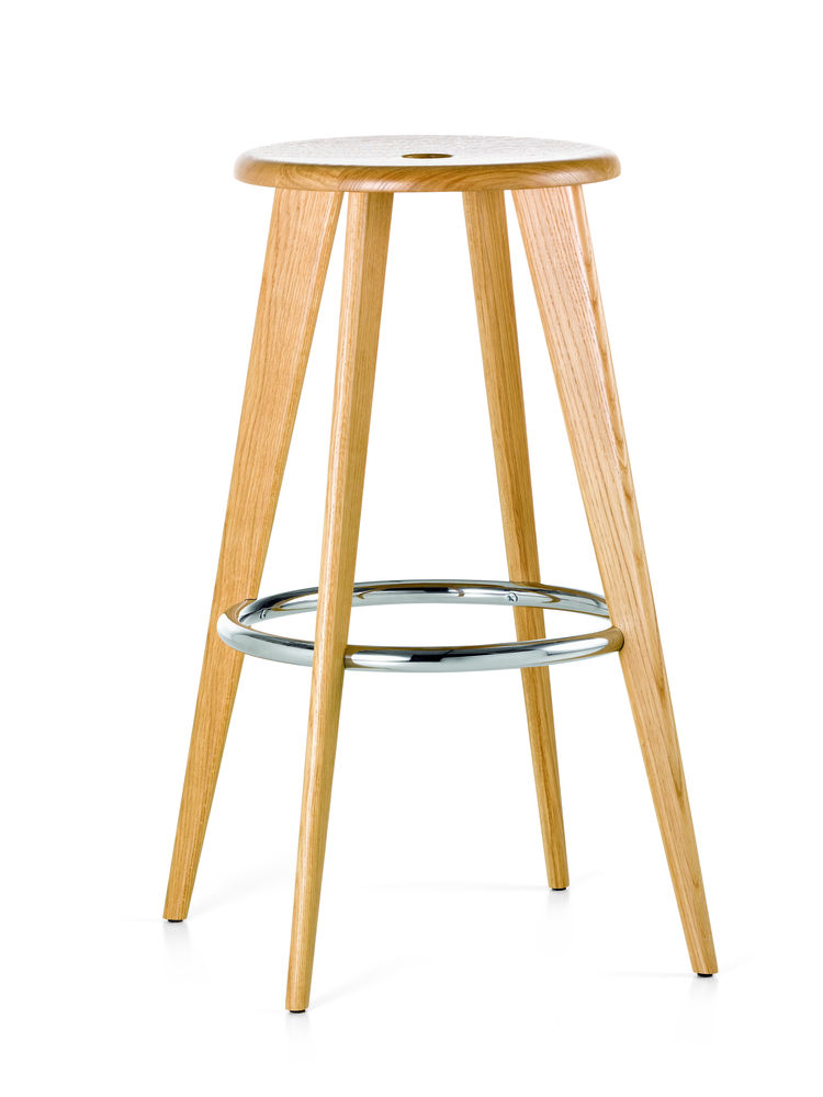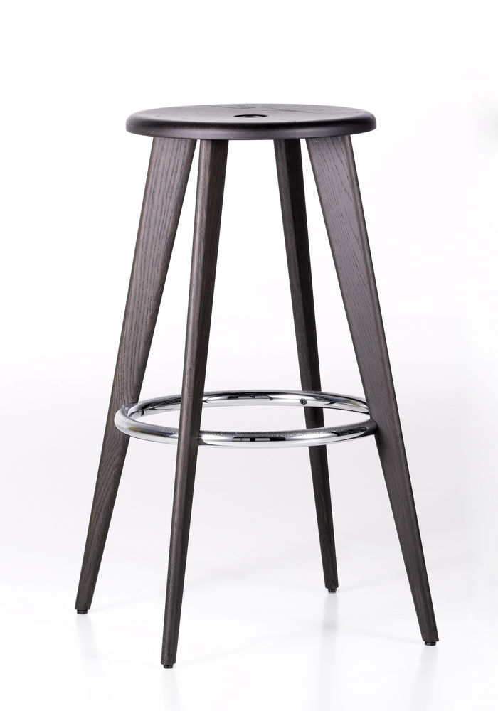 Beim Entwurf des Barhockers Tabouret Haut griff Jean Prouvé 1942 auf die traditionelle Formgebung eines Barhockers zurück, wobei sich aber die Beine – wie für Prouve typisch – nach unten verjüngen. Das Loch in der Sitzfläche soll als Greifloch dienen, der Beinreif ist zugleich die Fußstütze. Gezeigt wurde diese Reedition von Vitra übrigens erstmalig zu den Passagen 2007 im Rahmen unserer damaligen Jean Prouvé / Serge Mouille Ausstellung.