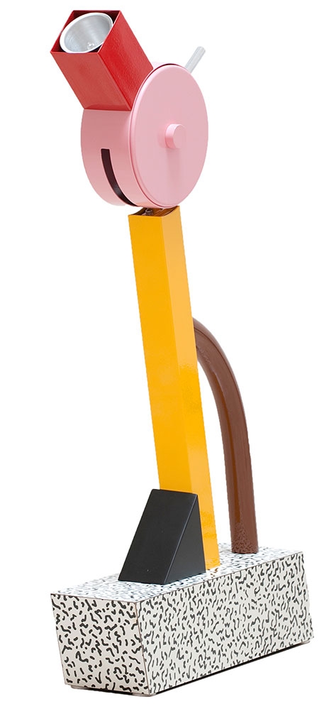 Geradezu spielerisch wirkt der Ettore Sottsass Entwurf der Tischleuchte Tahiti für Memphis in Form eines Vogelkopfes. Der Fuß zeigt das für Sottsass typische Bacterio-Muster, während der Hals und der Kopf der Leuchte in kräftigen Farben sind. An dem kleinen Metallstab kann der Lichtwinkel der Leuchte verstellt werden.