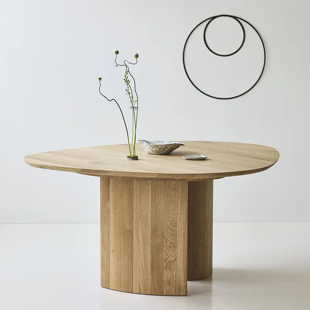 Der Name ist etwas verwirrend, denn der Tangent Table Round Esstisch hat eine ovale oder ellipsenförmige Formgebung-. Der Massivholztisch Tangent Table Round ist ein Entwurf der dänischen Architektin und Designerin Anne Boysen aus dem Jahr 2025, neben der hier angebotenen Version ist dar Tisch auch als längere Version bei DK3 erhältlich. Der Entwurf überzeugt nicht nur durch die schöne Materialiät, sondern auch durch die exentrische Formgebung der Unterkonstruktion.
