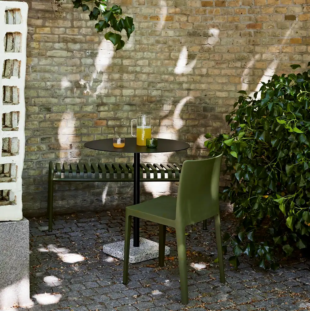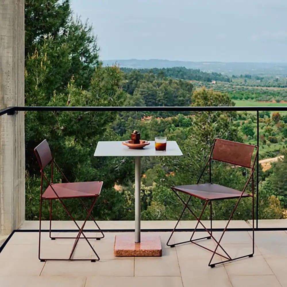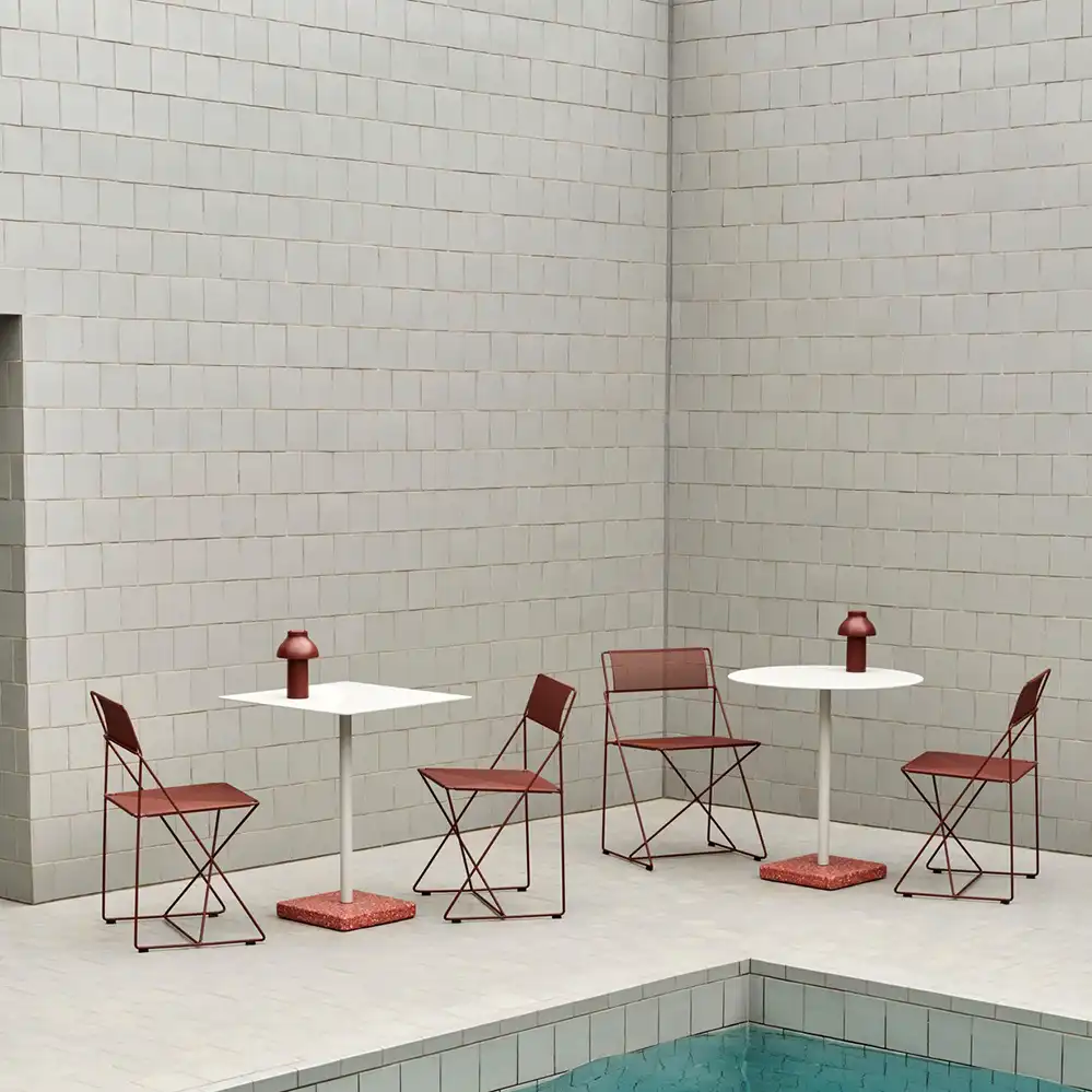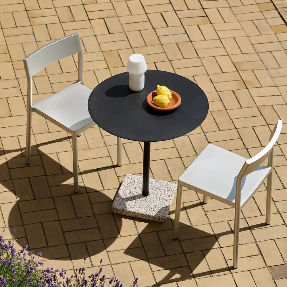 Der Terrazzo Tisch, entworfen vom schwedischen Designer Daniel Enoksson, zeichnet sich durch eine klare, funktionale Gestaltung aus. Die Tischplatte ist wahlweise rund oder quadratisch und besteht aus elektroverzinktem Stahl, der pulverbeschichtet ist, um eine hohe Widerstandsfähigkeit zu gewährleisten. Als Sockel dient Terrazzo – ein Material, das nicht nur durch seine Robustheit überzeugt, sondern auch durch seine einzigartige, charakteristische Oberfläche einen spannenden Kontrast zur schlichten Tischplatte bildet. Der Tisch ist für den Einsatz im Außenbereich konzipiert und eignet sich ebenso für vielfältige Anwendungen im Innenraum. Die hellgraue Version ist mit einem roten Terrazzo-Fuß versehen, die anthrazite Version mit einem grauen: