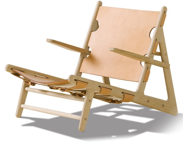 Der recht eigenwillige Jagdsessel (The Hunting Chair) von Børge Mogensen wurde 1950 zur Herbstausstellung der Tischlerinnung in Kopenhagen entworfen, die in jenem Jahr unter dem Motto Die Jagdhütte stand. Das Gestell ist aus Eiche gefertigt, während Sitz und Rücken aus Kernleder bestehen mit verstellbaren Spangen – eine rustikale und maskuline Kombination, an der Børge Mogensen später, u.a. in Verbindung mit dem Spanischen Sessel weiterarbeitete.