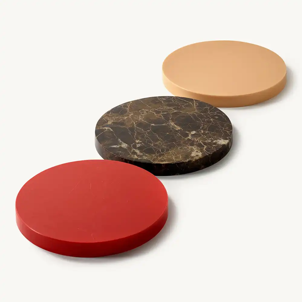 Die Three Circles von Muller Van Severen sind kreisförmig geformte und farblich aufeinander abgestimmte Objekte, die als Speiseunterlage dienen sollen. Die Three Circles bestehen aus zwei Polyethylen- und einer Marmorscheibe. In verschiedenen, durchdachten Farbkombinationen wird die neue Dreierkonstellation der Circles seit 2025 von valerie_objects vertrieben. Gestapelt wirken die drei Scheiben mit einem Durchmesser von 21 cm und einer Stärke von je 2 cm wie eine kleine Skulptur auf dem Esstisch.