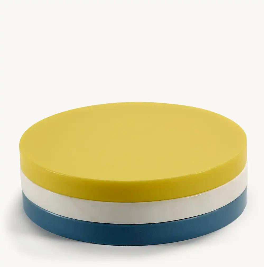 Die Three Circles von Muller Van Severen, hergestellt von valerie_objects, sind kreisförmig geformte und farblich aufeinander abgestimmte Objekte, die als Unterlagen für Speisen dienen sollen. Die Three Circles bestehen je aus zwei Polyethylen- und einer Marmorscheibe. In verschiedenen, durchdachten Farbkombinationen wird die neue Dreierkonstellation der Circles seit 2025 von valerie_objects vertrieben. Gestapelt wirken die drei Scheiben mit einem Durchmesser von 21 cm und einer Stärke von je 2 cm wie eine kleine Skulptur auf dem Esstisch.