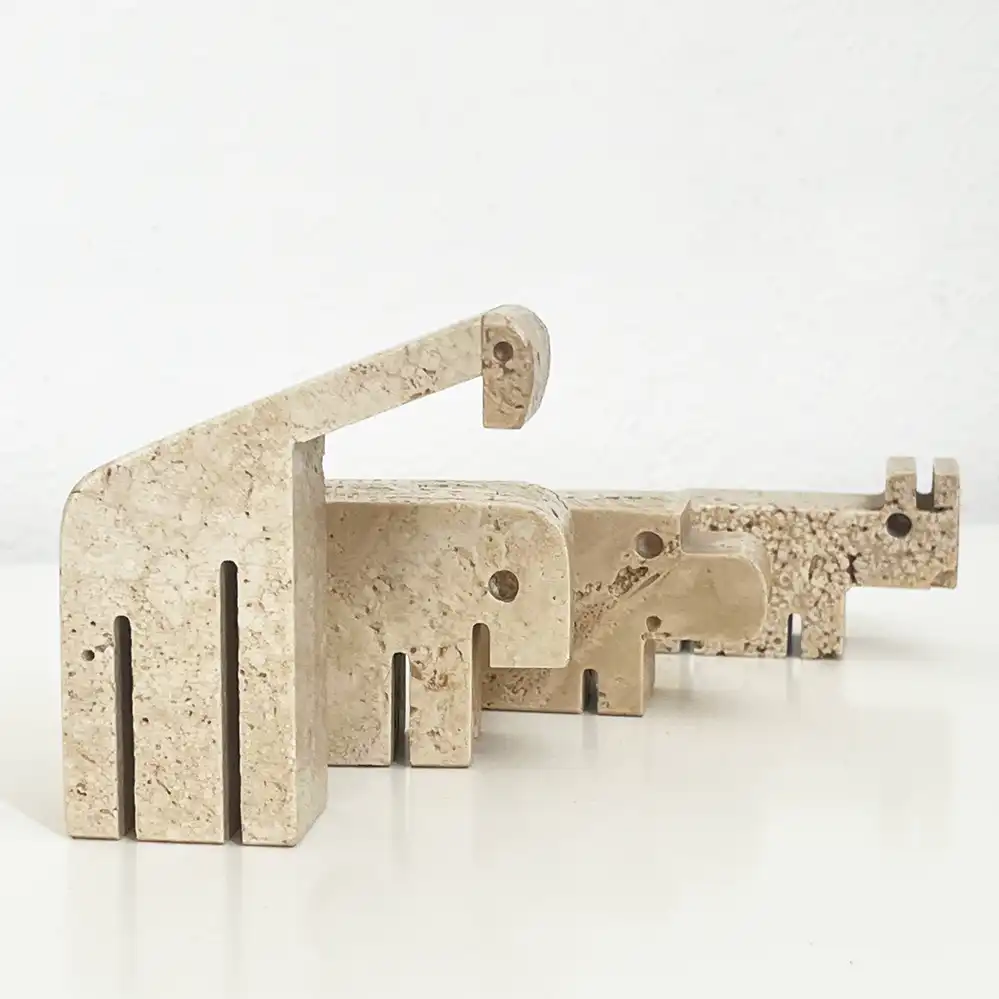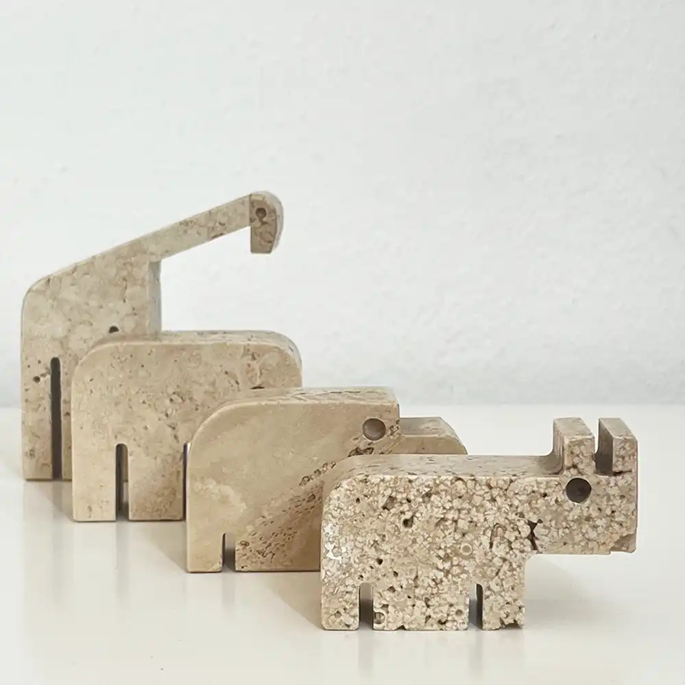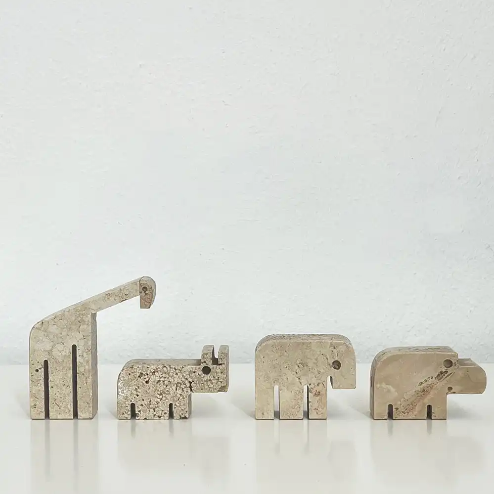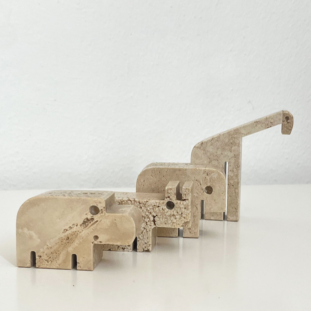 Die vier Travertin-Tierskulpturen stammen vermutlich von der Manufaktur Fratelli Mannelli aus Italien, der Designer ist wohl unbekannt. Im Internet wird der Entwurf häufig Enzo Mari zugeschrieben, dies konnten wir bisher nicht verifizieren. Für weitere Informationen wären wir sehr dankbar!