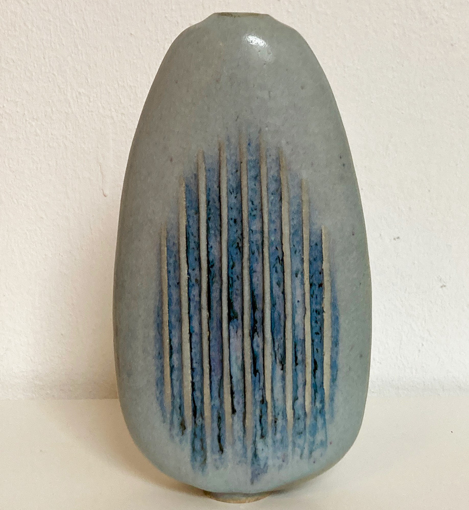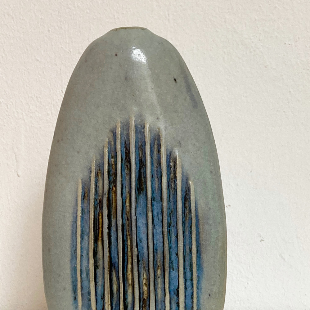Die im Dekor gerippte Vase ist ein Entwurf der Bremer Keramikerin Dorothee Colberg-Tjadens aus den 1970er oder 80er Jahren und besticht durch ihre Ausgestaltung.