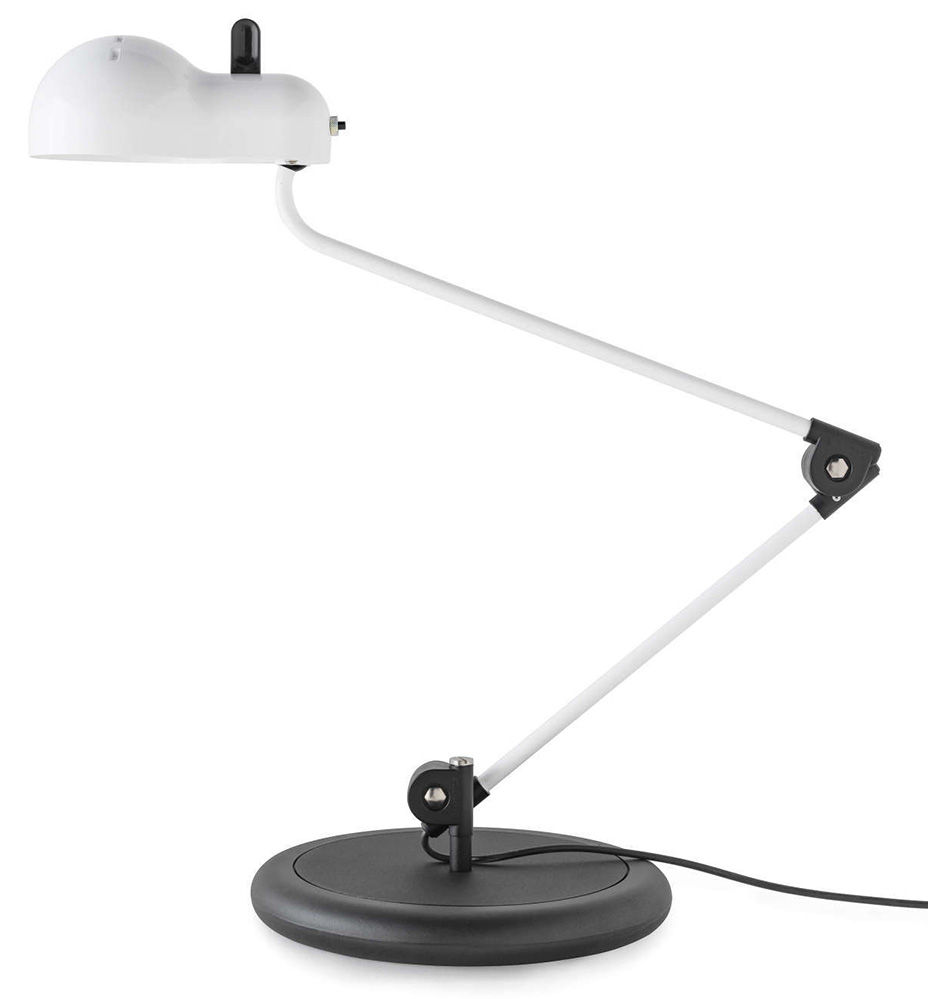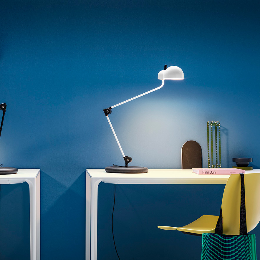 Die Leuchtenserie Topo entwarf Joe Colombo 1970 für Stilnovo, die hier angebotene Variante verfügt über den runden schweren Tischfuß. Inspierung zu dem Entwurf fand Joe Colombo damals in der Automobilindustrie: Die Schlitze am Reflektor sollen an die Luftschlitze der Sportautos der 1960er Jahre erinnern, die Form des Reflektors an die Kurven der klassischen E27 Glühbirne, wie eine Karosserie auf dem darunterliegenden Motor eines Autos. Die Gelenkarme der Topo erlauben die Leuchte ganz nach Belieben auszuziehen oder einzuziehen. Erhältlich ist der Leuchtklassiker von Stilnovo in verschiedenen Farbkombinationen: