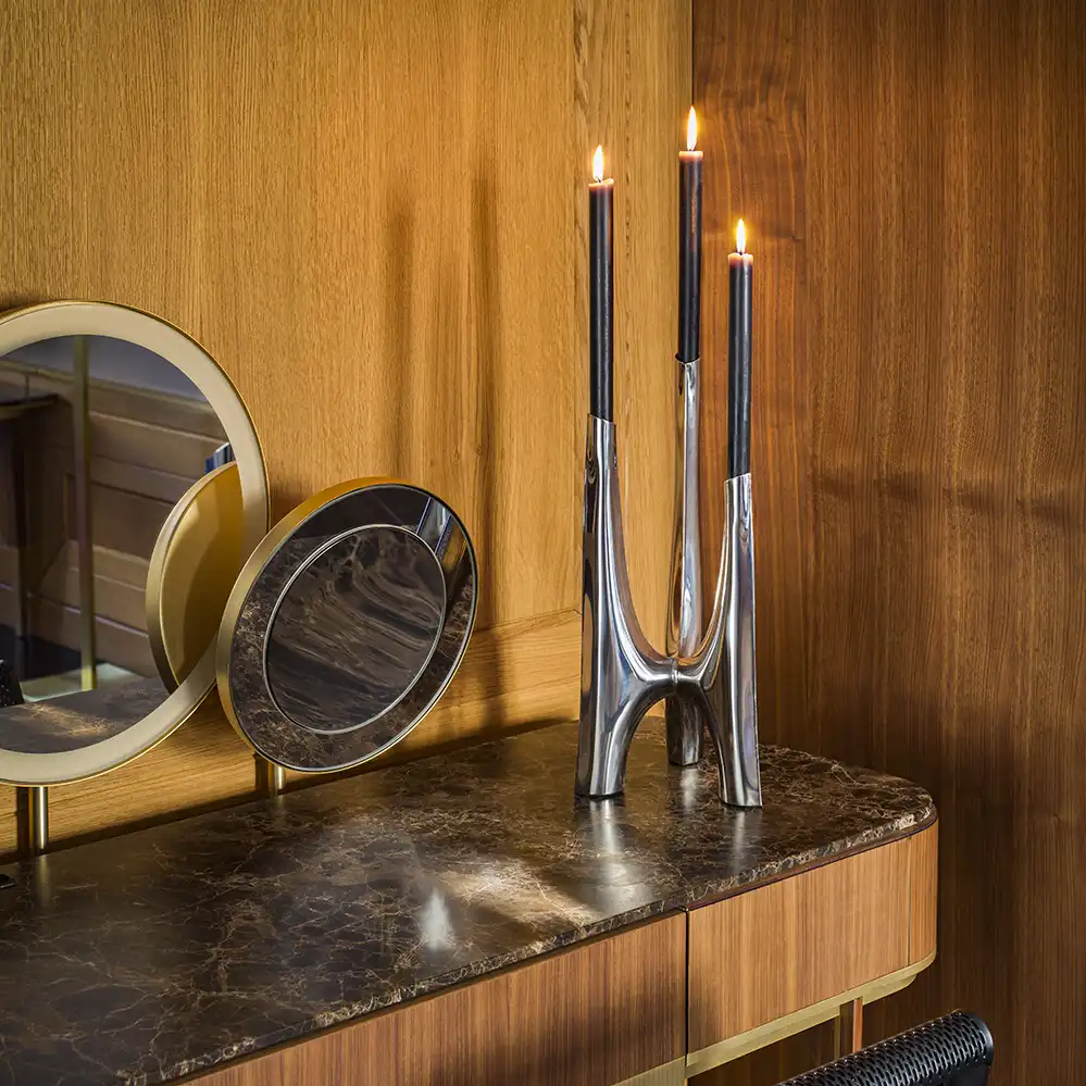 Triglav Kandelaber ist ein moderner Designer-Kerzenleuchter aus Stahl, inspiriert von den schlanken, hoch aufragenden gotischen Gewölben. Die drei unterschiedlich hohen Arme erinnern an architektonische Strukturen und vereinen filigrane Ästhetik mit Stabilität. Als exklusives Wohnaccessoire vom polnischen Zieta Studio verändert sich seine räumliche Wirkung je nach Betrachtungswinkel durch die asymmetrische Form. Hergestellt mit der innovativen FiDU-Technologie, verbindet dieser Premium-Kerzenständer filigranes Metalldesign mit außergewöhnlicher Stabilität. Die hochglänzende Oberfläche reflektiert das Licht, während die mitgelieferten Stearinkerzen eine nachhaltige Alternative zu Paraffinkerzen bieten.