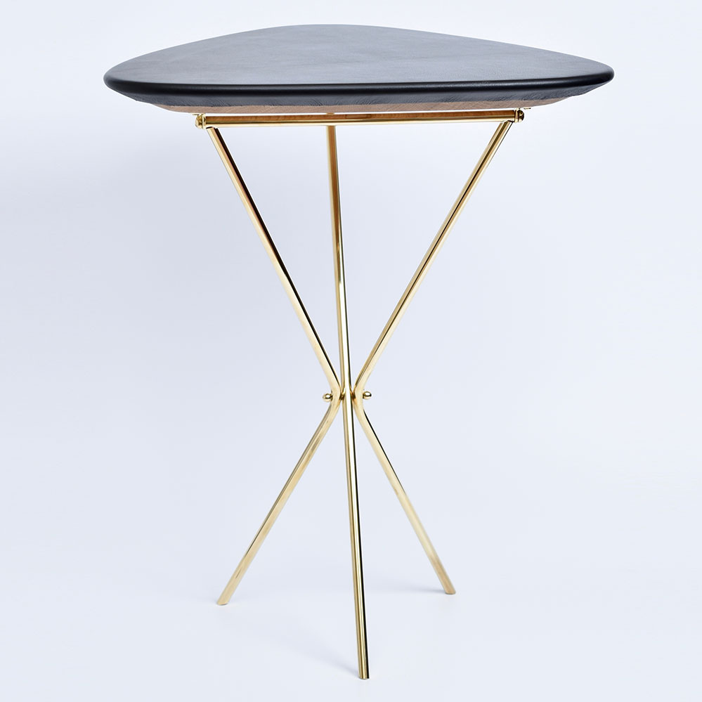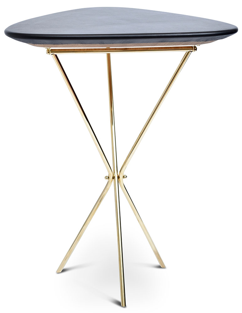 Österreichs Widereintrtt in das internationale Design nach dem Zweiten Weltkrieg: Der Entwurf des Tripod Tisches entstand Ende der 1940er Jahre, der Tisch wurde direkt Exponat der Ausstellung GOOD DESIGN im MoMa Museum of Modern Art in New York 1951, wo der Auböck Entwurf neben Möbels von Charles & Ray Eames, Florence Knoll oder Anni Albers stand. Denn der kleine, elegante Tripod Beistelltisch von Carl Auböck 2 überzeugt durch Form und die Materialität: Das Gestell ist aus Messing, die Eiche-Tischplatte ist mit schwarzem Leder überzogen.