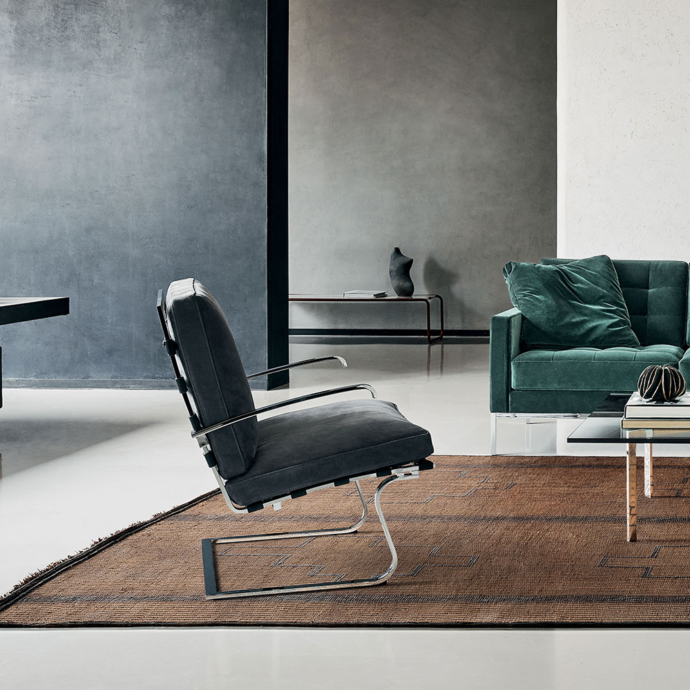 Die Villa Tugendhat in Brünn gilt als einer der wichtigsten Bauten der Moderne, hierfür entwarf Ludwig Mies van der Rohe auch die Gesamteinrichtung, zu der der gleichnamige Sessel aus dem Jahr 1929 zählte. Im Gegensatz zum berühmten Barcelona Sessel haben diese Tugendhat Sitzmöbel ein ganz anderen Sitzkomfort, da sie wie ein Freischwinger fungieren. In der Villa Thugendhat verwendeten Ludwig Mies van der Rohe und Lilly Reich diese sogenannten Feder-Sessel wahlweise in Stoff und in Leder. Bereits in den 1960er und 70er Jahren wurde der Klassiker von Knoll International gefertigt, 2024 erfolgte eine neue Edition.