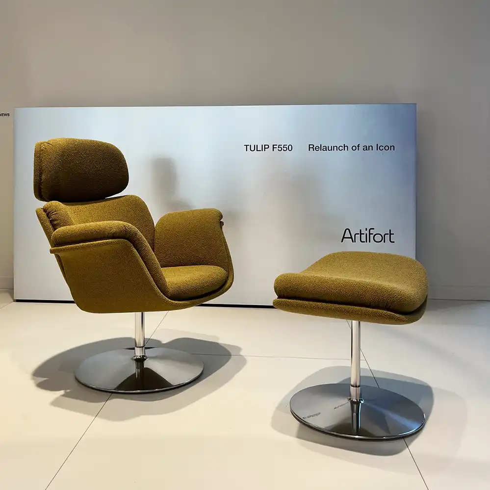 2025 legte Artifort den drehbaren Tulip F550 Lounge Chair von Pierre Paulin aus den frühren 1960er Jahren wieder auf. Der Sessel zählt zu einer ganzen Möbelserie, die er damals für Artifort entwickelte (zum Beispiel als Barstuhl oder Stuhl). Die Namensähnlichkeit zu dem Knoll Tulip Chair von Eero Saarinen war damals sicherlich gewollt. Der Tulip F550 Sessel ist bei Markanto abweichend von den ersten Abbildungen wahlweise mit den Bezugsstoffen Artifort Selecte oder Tonus erhältlich (weitere Stoffe oder Leder gerne auf Anfrage). Zusätzlich ist der Sessel noch mit dem sogenannten Cross-Base Fußgestell aus Edelstahl erhältlich.